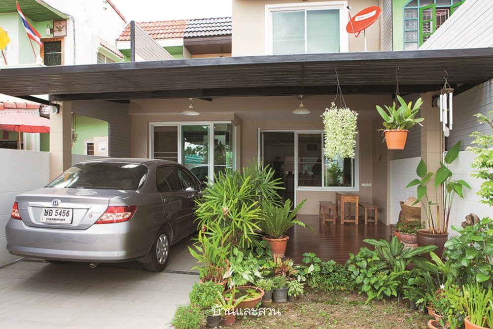 หน้าบ้านปรับเป็นระเบียงไม้นั่งเล่นขนาดใหญ่ หน้าประตูบ้านมุมหนึ่งจัดเป็นสวนหย่อมที่มีน้ำพุ ปลูกไม้น้ำและไม้กระถางแขวนขนาดเล็ก เปลี่ยนอารมณ์แห้งแล้งของอิฐและปูนให้เป็นสีเขียวธรรมชาติได้อย่างน่ารัก ผนังหลังบ้านกรุสมาร์ทบอร์ดบนโครงเหล็ก เพิ่มส่วนครัวและลานซักล้างให้เป็นสัดส่วน บ้านทาวน์เฮ้าส์ที่ทั้งมืดทึบและคับแคบก็กลับกลายเป็นบ้านที่เรียบโล่งโปร่งสบายได้จริง