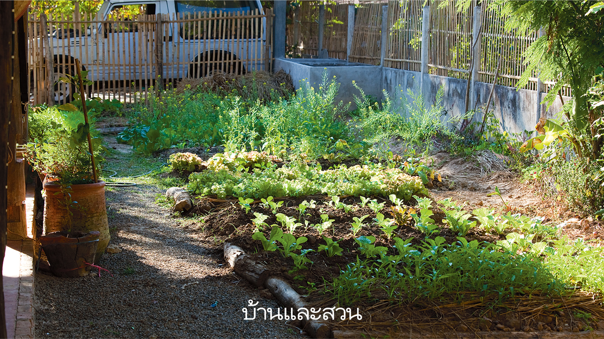 คุณมิ้นพาเราเดินชม แปลงผักสวนครัว ที่อยู่อีกฟากของฝั่งคลอง ซึ่งเธอปรับพื้นที่ทำเป็นแปลง ปลูกผัก ไว้รับประทานเองได้อย่างน่ารัก พื้นที่ 40 ตารางเมตร ประเภทผักที่ปลูกคือ ผักกาด ผักบุ้ง กวางตุ้ง ตั้งโอ๋ ต้นหอม ผักโขม และผักสลัด เช่น เรดโอ๊ก มีห้องทำงานแบบส่วนตัวของคุณเอ๋ให้นั่งรับลมชมสายน้ำ ทั้งยังเป็นมุมโปรดของเด็กๆ ที่มัก วิ่งเล่นซ่อนแอบกันอีกด้วย