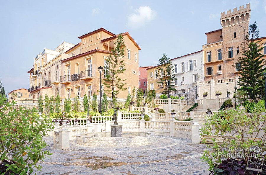 เราเดินทางมาถึงที่นี่ตั้งแต่เช้าตรู่ ทันเห็นหมอกจางๆที่ลอยกรุ่นละเลียดไปกับ บ้านสไตล์อิตาลี ที่ตั้งเรียงรายดูราวกับ ภาพเมืองในสายหมอกซึ่งค่อยๆเผยออกจากที่ซ่อนมาให้เห็น เมื่อข้ามสะพานหินเข้าไปด้านใน แนวกำแพงที่โอบล้อมก็ดูเหมือนจะพาเราเข้าไปสู่เมืองเล็กๆแห่งหนึ่ง คุณอำนาจ คีตพรรณา สถาปนิกผู้ดูแลการออกแบบโครงการทั้งหมด เล่าถึงภาพความคิดเริ่มแรกก่อนจะ ค่อยๆก่อร่างจนกลายเป็นหมู่บ้านที่แวดล้อมด้วยสวนสวยแบบที่เห็น
