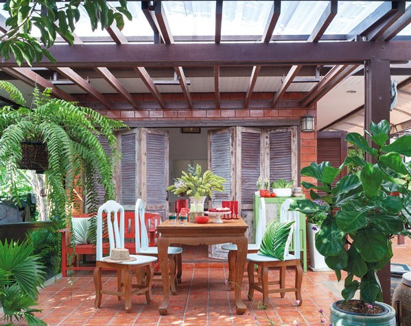 AFTER เมื่อเพิ่มสีสันให้มุมรับประทานอาหารนอกบ้าน ก็ทำให้บรรยากาศดูเปลี่ยนไปอย่างสิ้นเชิง โดยเลือกใช้ทฤษฎีสี 60 : 30 : 10 กล่าวคือ สีแดงและสีน้ำตาลส้ม 60 เปอร์เซ็นต์ สีเขียว 30 เปอร์เซ็นต์ และสีฟ้า 10 เปอร์เซ็นต์ เน้นให้เกิดความกลมกลืนไปกับสวนโดยรอบ ซึ่งปลูกต้นไม้หลากหลายชนิด เช่น ปาล์มยะวา เฟินสไบนาง ไทรใบสัก สร้างความมีชีวิตชีวา นอกจากนี้ยังปรับแปลนการใช้งานใหม่ ย้ายม้านั่งไปไว้ติดกับมุมครัว เพื่อให้พื้นที่ของโต๊ะรับประทานอาหารกว้างขวางและใช้งานได้สะดวกขึ้น
