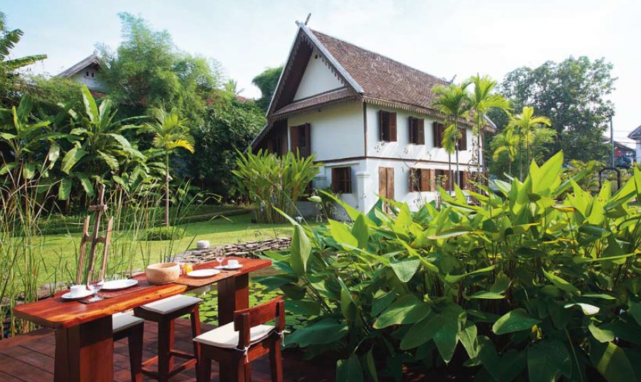 อาคารสองชั้น ที่มีอายุร้อยกว่าปี สร้างด้วยไม้สักทองทั้งหลังนี้ เคยเป็นตำหนักเก่าของพระญาติอดีตกษัตริย์ลาวพระองค์หนึ่ง ซึ่งเดิมทีใช้วัสดุไม้เป็นหลัก ทั้งผนังและเพดาน แต่บ้านค่อนข้างทึบ จึงปรับให้เป็นผนังก่ออิฐฉาบปูนด้วยวิธีโบราณแล้วทาสีขาว ช่วยทำให้บ้านดูโปร่งขึ้น ภายในบ้านตกแต่งในสไตล์ร่วมสมัยด้วยภาพวาดสีสันสดใสดูมีชีวิตชีวา และพื้นที่หลังบ้านก็ทำเป็นแปลงพืชผักสวนครัวขนาดย่อมที่เจ้าของบ้านมักจะเอาไปประกอบอาหารทานกันในครอบครัวอีกด้วย