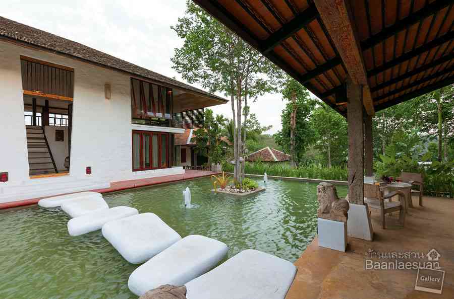 เมื่อเดินไปด้านหลังจะพบอาคารขนาดเล็กซึ่งเป็นส่วนของห้องพัก 2 ห้องที่วางตัวอาคารยาวขนานไปกับอาคารหลัก ออกแบบให้มีหน้าตาและกลิ่นอายของความเป็นไทยที่ผสมผสานกับความเป็นเอเชีย ตะวันออกได้อย่างไม่ขัดเขิน สิ่งที่สะดุดตาผมมากที่สุดคงหนีไม่พ้นบ่อน้ำขนาดใหญ่สีเขียวมรกตซึ่งอยู่ ระหว่างอาคารทั้งสองหลัง โดยทำทางเดินเชื่อมดีไซน์เก๋ไก๋ที่ออกแบบเป็นรูปทรงโค้งมนสีขาวดูบางเบา เสมือนล่องลอยอยู่กลางน้ำ