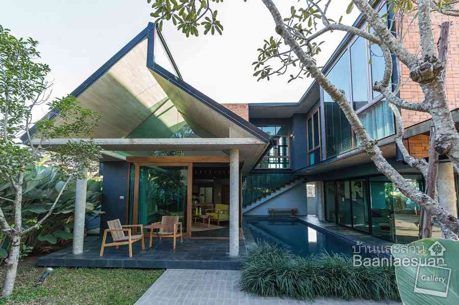 บ้านสวยสไตล์โมเดิร์น หลังนี้เป็นบ้านปูนสองชั้นออกแบบแปลนเป็น รูปตัวซี (C ) หันหน้าไปทางทิศเหนือ ทำให้ได้แสงธรรมชาติในช่วงบ่าย ส่วนด้านหน้าเป็นห้องนั่งเล่นชั้นเดียวเปิดเพดานโล่ง โดยมีหลังคาทรงจั่วแหลมสูงและมีแนวเอียงในองศาที่ต่างกัน เพื่อให้ส่วนต่างของโครงหลังคาทั้งสองมีช่องว่างที่เป็นช่องแสงช่วยเพิ่ม ความสว่างให้ภายใน ส่วนด้านหลังเป็นบ้านทรงกล่องสองชั้น แปลนบ้านที่วางเป็นรูปตัวซียังทำให้เกิดพื้นที่ว่างในส่วนกลางบ้าน ซึ่ง คุณขวัญชัย สุธรรมซาว สถาปนิกผู้ออกแบบ บอกว่า มีส่วนคล้ายกับชานกว้างของบ้านเรือนไทย แต่บ้านนี้ปรับเป็นสระว่ายน้ำที่มีมุมนั่งเล่นรอบสระแทน ช่วยสร้างความรู้สึกเย็นสบายให้บ้านได้เป็นอย่างดี นอกจากนี้ตัวบ้านทั้งสองฝั่งยังช่วยบังแสงแดดยามบ่ายให้สระว่ายน้ำ รวมถึงห้องนั่งเล่นด้วย