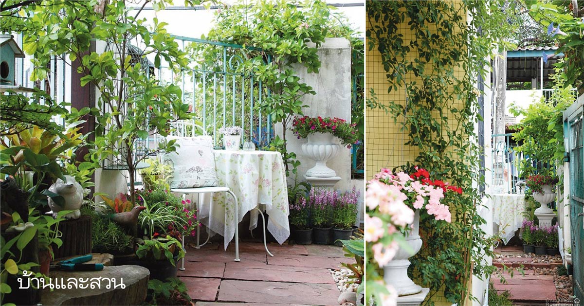 ซึ่งการ จัดสวนเอง ก่อนจะบันดาลใจได้แน่นอนว่าย่อมมาจากความรักความชอบเสียก่อน คุณเล็ก – บุษกรและคุณนนท์ – พิทยา กิจติวรานนท์ ตกหลุมรักสวนแนววินเทจเข้าอย่างจัง ด้วยความชอบจึงอยากมีสวนเล็กๆไว้ในบ้าน ทั้งสองค่อยๆสร้างพื้นที่สีเขียวแทรกตัวไปตามมุมบ้าน แม้มีพื้นที่จำกัดแต่ก็เต็มไปด้วยธรรมชาติในทุกมุมมอง