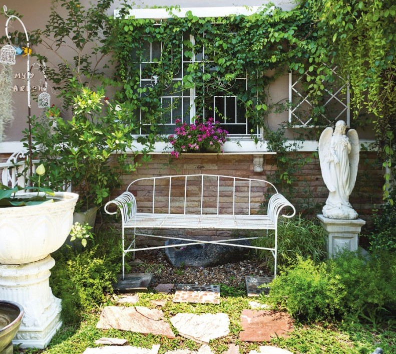 คุณกัลยาณีชื่นชอบของตกแต่งสไตล์วินเทจ ยามที่ไปเดินตลาดต้นไม้หรือร้านขายเฟอร์นิเจอร์ มักได้ของแต่งสวนกลับมาด้วย ไม่ว่าจะเป็นชิ้นเล็กประเภทกระถางเอิร์น กระถางปูน ไปจนถึงชิ้นใหญ่ๆอย่างม้านั่ง คิ้วบัวปูนปั้น จนพักหลังมานี้เจ้าตัวบอกกับผมว่าคงต้องหยุดซื้อบ้าง เพราะที่บ้านไม่พอวางแล้ว (ฮา) หลายมุมในสวนนอกจากจะมีของสวยๆประดับแล้ว จะพบเห็นไอเดียประยุกต์ใช้ของเก่ามาดัดแปลงเป็นของแต่งสวนอยู่ประปราย