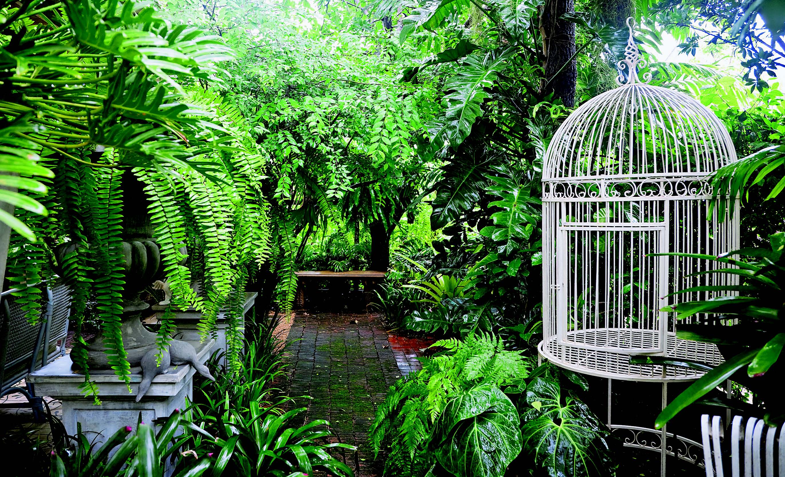 สวนด้านข้างและด้านหลังมีต้นปีบและต้นจิกเป็นไม้ใหญ่ไล่ลงมามีโมกพุดการ์ดิเนียถัดลงมาเป็นไม้ใบกระถางที่หลากหลายทั้งเฟินฟิโลเดนดรอนหน้าวัวใบโดยเลือกปลูกข่อยตัดแต่งเป็นรั้วเพื่อความนุ่มนวลพื้นปูอิฐมอญที่มีมอสส์ขึ้นสวยเพราะได้แสงรำไร ไม้ใบที่เลือกมาใช้ส่วนใหญ่เป็นไม้กระถางนอกจากเพื่อการปรับเลี่ยนแล้วไม้ใบบางชนิดถ้าลงดินจะไม่ดีเท่าที่ควรเพราะเหมาะกับวัสดุปลูกที่มีส่วนผสมของกาบมะพร้าวมากกว่าเพื่อการระบายน้ำที่ดี