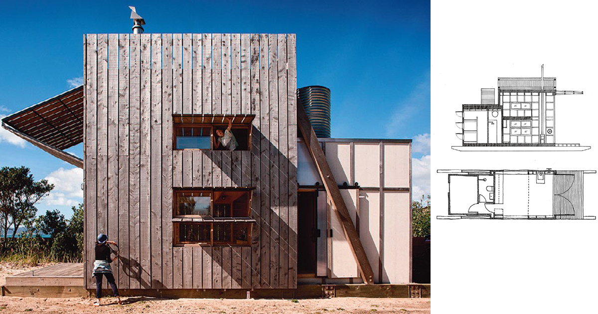 กระท่อมโลดแล่น รักษ์สิ่งแวดล้อม “The Hut on Sleds” เป็นบ้านกล่องสไตล์โมเดิร์นสุดล้ำที่ไม่ได้มีดีแค่ขนาดพื้นที่ใช้สอยที่กะทัดรัด แต่ยังเคลื่อนที่ได้ เพราะสร้างบนโครงสร้างคานไม้ขนาดใหญ่ลักษณะคล้ายบ้านลากเลื่อน แถมยังมีระบบกักเก็บน้ำฝนไว้ใช้ในบ้าน ออกแบบโดย Crosson Clarke Carnachen Architects กลุ่ม สถาปนิกชาวนิวซีแลนด์ เพื่อแก้ปัญหาบ้านที่มักได้รับความเสียหายจากการกัดเซาะอย่างรุนแรงตามชายฝั่งทะเล
