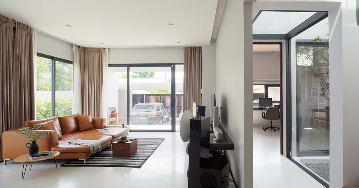 การออกแบบภายในอย่างเรียบง่ายที่เน้นสีขาวตัดสลับกับกรอบบานสีเข้ม ทำให้ตัวบ้านเหมือนภาพเรขาคณิต ตัดสลับกับสีเอิร์ธโทนของไม้ โซฟาหนัง และผ้าม่านสีน้ำตาลอ่อน ช่วยเบรกให้บ้านดูอบอุ่นขึ้น ไม่เฉียบคมจนเกินไป แต่ละพื้นที่ซึ่งดูคล้ายห้องสี่เหลี่ยมเชื่อมต่อเข้าหากันด้วยจังหวะที่พอดิบพอดีจนกลายเป็นพื้นที่ต่อเนื่องกันไปตลอดทั้งหลัง