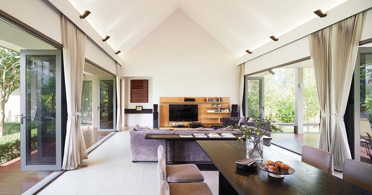 เพิ่มลูกเล่นให้หลังคาทรงจั่วด้วยการเติมแสงไฟส่องสว่างที่ไม่ใช่แค่ไฟดาวน์ไลท์ เช่น ใช้ไฟสปอตไลท์เน้นจุดสำคัญให้ฝ้าเพดานสวยเด่นขึ้นมา ก็ทำให้โถงนั่งเล่นมุมกว้างที่มีแสงธรรมชาติเข้ามาเต็มที่ สวยได้แบบเฉพาะจุด