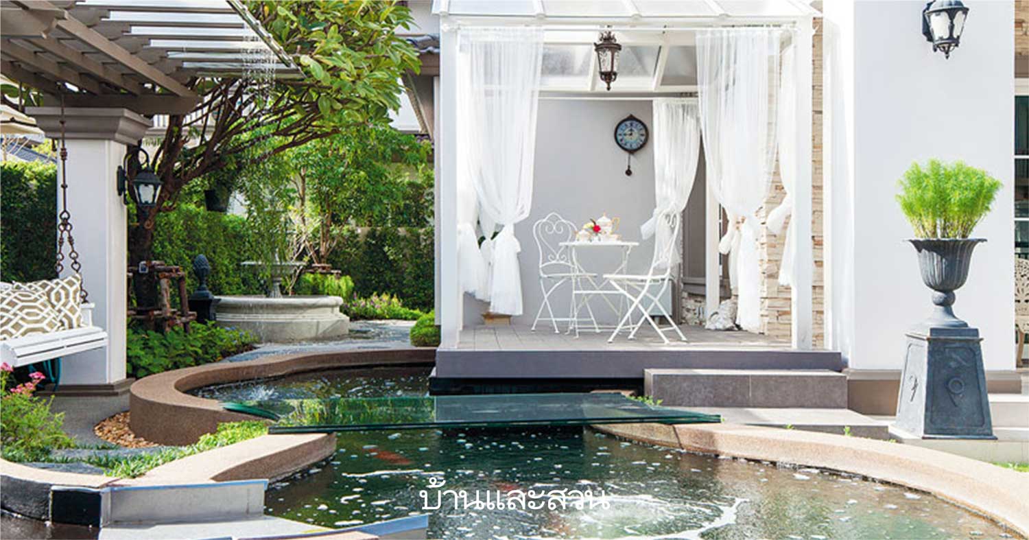 เรามาสะดุดตากับบ่อน้ำรูปทรงฟรีฟอร์มสวยงาม มีจังหวะการไหลและเสียงน้ำหนักเบาที่แตกต่างกันราวกับเสียงดนตรี นี่เป็นแนวคิดส่วนหนึ่งของ คุณบี – อรรถวุฒิ สกนธวัฒน์ เจ้าของบ้านฝ่ายชายเกี่ยวกับวิธีการใช้น้ำในบ้านอย่างคุ้มค่า และ คุณปูเป้-สุจีรา สกนธวัฒน์ เจ้าของบ้านฝ่ายหญิงผู้หลงใหลและชื่นชอบการจัด สวนวินเทจ เป็นอย่างมาก