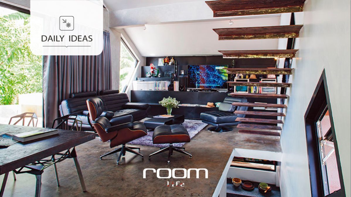 เพิ่มลุคให้บ้านดูดิบเท่แต่ไม่เถื่อนด้วยการทําบันได จากแผ่นเหล็กหนา 6-8 มิลลิเมตร นํามาพับเป็น ขั้นบันไดรูปตัวแอล (L) แบบคว่ำเพื่อเพิ่มความแข็งแรง ตัวแผ่นเหล็กจะยึดติดกับโครงสร้างผนังด้านใน ทาสีกันสนิม 2 รอบก่อน แล้วจึงเลือกสีชนิดทาโลหะมาทาตามชอบ