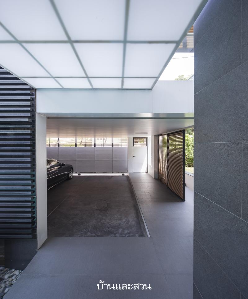 จากผืนที่ดิน ตัวอาคารจำเป็นต้องสร้างเต็มพื้นที่เพื่อให้เพียงพอต่อการใช้งาน โดยเกือบ 80 เปอร์เซ็นต์ของพื้นที่หน้าบ้านเป็นของโรงรถ บริเวณชั้นล่างจึงจัดสรรให้เป็นพื้นที่ส่วนกลางอย่างสระว่ายน้ำ และห้องนั่งเล่นห้องครัว รวมทั้งห้องนอนคุณพ่อซึ่งเป็นไปตามความต้องการที่จะอยู่ชั้นล่างสุด เข้า-ออกได้สะดวก และมีสวนส่วนตัวขนาดเล็ก โดยเพิ่มพื้นที่เอ๊าต์ดอร์ให้บ้านอีกแห่ง ด้วยการใช้หลังคาโรงรถทำหน้าที่เป็นลานกว้างสำหรับทำกิจกรรมเอ๊าต์ดอร์