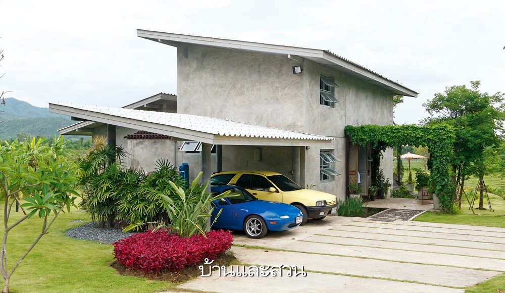 บ้านปูนเปลือย ชั้นเดียวที่ตั้งอยู่ในอำเภอแม่ออน จังหวัดเชียงใหม่ ท่ามกลางผืนนาและทิวเขาที่เรียงสลับกันอยู่เบื้องหน้าบ้าน ตัวบ้านมีลักษณะคล้ายบ้านแฝด มีสองเรือนเชื่อมกัน และทำหลังคาแบบเพิงหมาแหงนหันเข้าหากัน ก่อสร้างโดยช่างชาวบ้าน ซึ่งได้ผลลัพธ์ที่ดีไม่น้อยบ้านชั้นเดียวปูนเปลือย