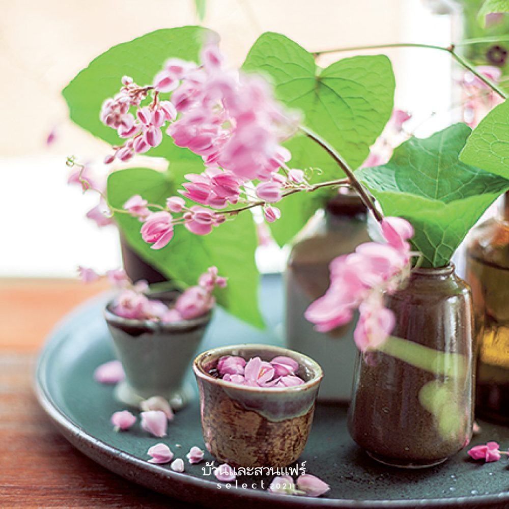 ไม้แดดกินได้ อันแรกคือไม้เลื้อยขนาดกลางดอกรูปหัวใจสีชมพูเล็กๆที่เห็นนี้มีถิ่นกําเนิดในประเทศเม็กซิโก มีชื่อสามัญหลายชื่อด้วยกัน ได้แก่ MexicanCreeper, ChainofLove, PinkVine, CoralVine มีดอกตั้งแต่สีขาว ชมพู ไปจนถึงสีชมพูเข้ม นอกจากดอกที่เป็นรูปหัวใจแล้ว ใบของพวงชมพูก็มีลักษณะเป็นรูปหัวใจสวยไม่แพ้กันสามารถปลูกได้ทุกพื้นที่ ในดินทุกชนิด ลักษณะนิสัยชอบแดดเต็มวัน จึงเป็นไม้เลื้อยยอดนิยมที่มักพบเห็นปลูกกันทั่วไป ช่อดอกอ่อนนำมาชุบแป้งทอด กินเป็นของว่างได้