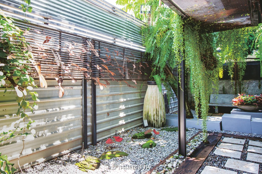 ต้องปิดตัวลง ทํา ให้มีโอกาสกลับมาใช้เวลาอยู่ร่วมกับครอบครัวมากยิ่งขึ้น ซึ่งกิจกรรมที่บ้านนี้ทําร่วมกันเสมอคือการจัดสวนและดูแลต้นไม้ที่เดิมก็มีอยู่แล้ว ยิ่งเพิ่มให้ดูสวยงามและน่าอยู่มากขึ้น เห็นได้ตั้งแต่ด้านนอกบ้าน ตลอดแนวรั้วซึ่งใช้แผ่นหลังคาอะลูมิเนียมสไตล์โมเดิร์นลอฟต์ดูมีชีวิตชีวาด้วยต้นไม้หลากหลายสีสันและสายพันธุ์ที่ขึ้นแทรกจนครึ้ม ทําให้บ้านดูสะดุดตาและน่าสนใจกว่าบ้านหลังอื่นๆ ที่อยู่ในโครงการจัดสรร เชื้อเชิญให้เราอยากเข้าไปเยือนสวนป่าเล็กๆ ที่ซ่อนอยู่ภายในบ้าน