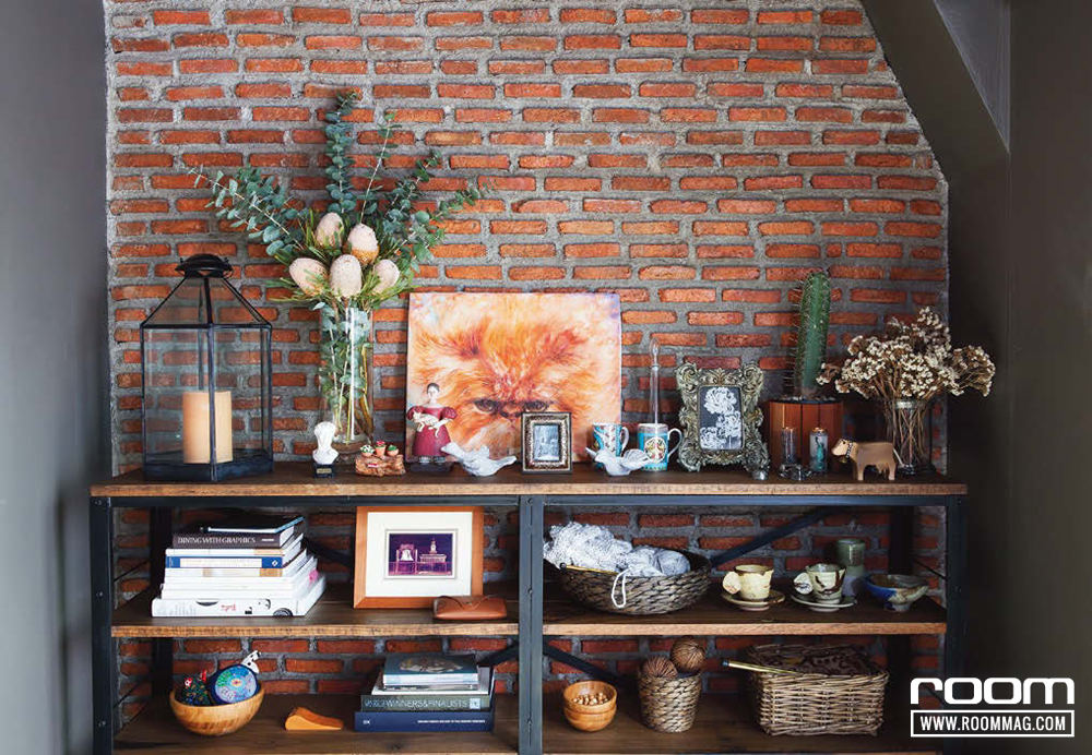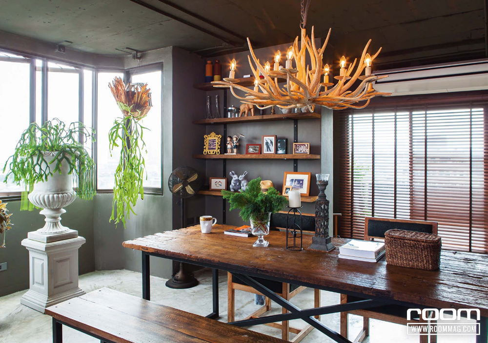 “เราอยากได้โต๊ะสักตัวแบบเรียบ ๆ แต่ใส่ใจในดีเทล ไปเดินหาไม้หลายที่ จนได้บานตู้เสื้อผ้าไม้สักเก่าหน้ากว้างสองชิ้นนำมาเป็นท็อปโต๊ะ ถ้าสังเกตดี ๆ จะเห็นที่ขอบยังเป็นรอยบากสำหรับใช้เป็นสลักประกอบเป็นตู้อยู่เลย ติดตั้งเข้ากับขาโครงเหล็กสีดำทำเอง พอเสร็จแล้วก็ออกมาถูกใจมาก เหมือนเป็นการสะท้อนความเป็นตัวเราออกมาจริง ๆ ”