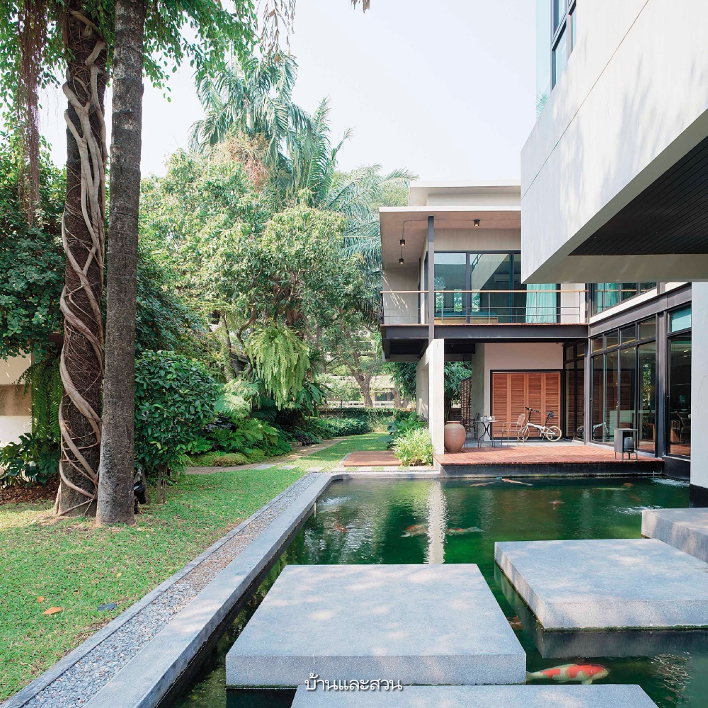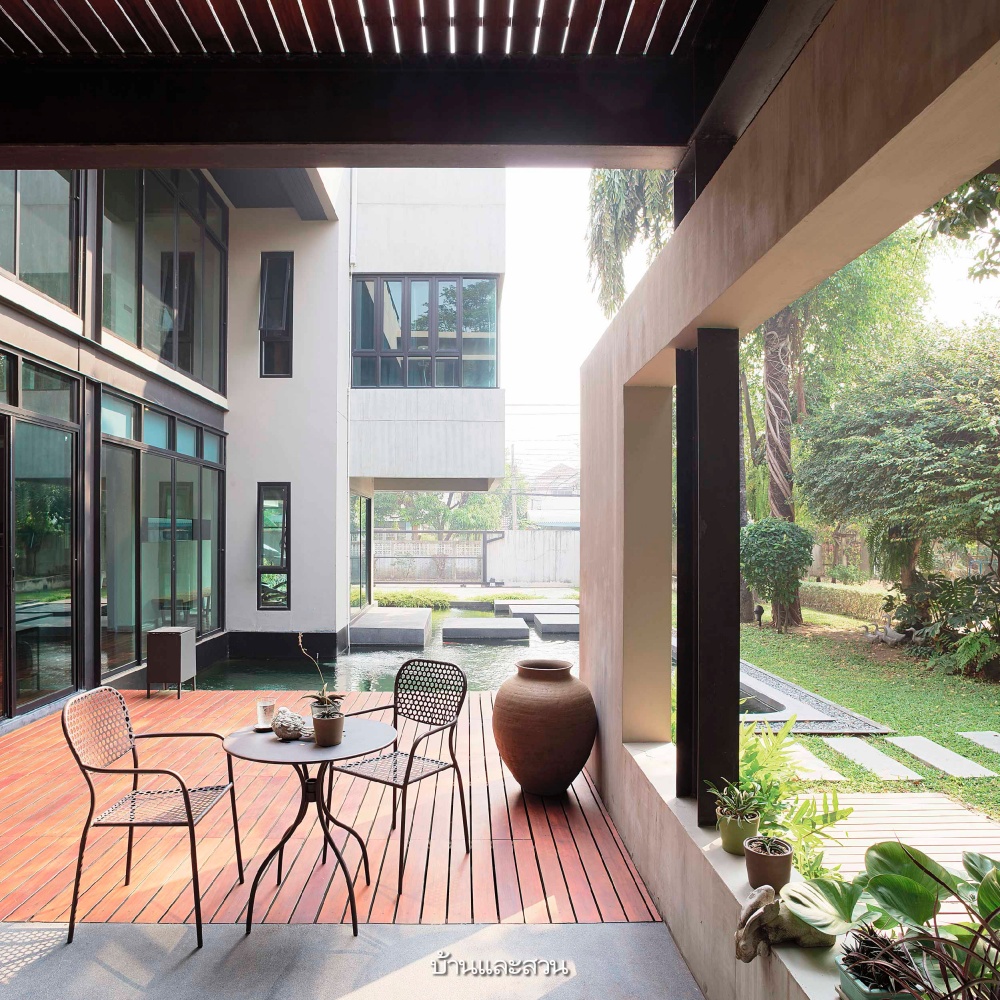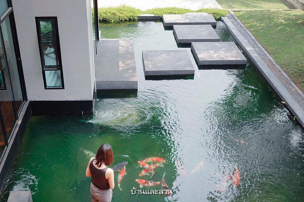 คุณแป้ง – กษิต จันทร์แก้ว คือสถาปนิกผู้ออกแบบ ทั้งยังเป็นเพื่อนสนิทที่รู้จักเจ้าของบ้านมาตั้งแต่เด็ก ตัวบ้านวางผังเป็นรูปตัวยู (U) หันหน้าเข้าหาบ้านหลังเดิม มีระเบียงไม้เล็กๆ เป็นพื้นที่อเนกประสงค์อยู่ตรงกลาง พร้อมออกแบบให้มีบ่อปลาคาร์ปขนาดใหญ่ตามที่คุณป้องชอบ โดยหล่อขึ้นรูปแผ่นพื้นคอนกรีตทำเป็นทางเดินลอยเหนือผืนน้ำ จัดวางจังหวะให้ดูน่าสนใจ เชื่อมต่อจากจุดนี้ไปยังที่จอดรถหน้าบ้านได้อีกด้วย