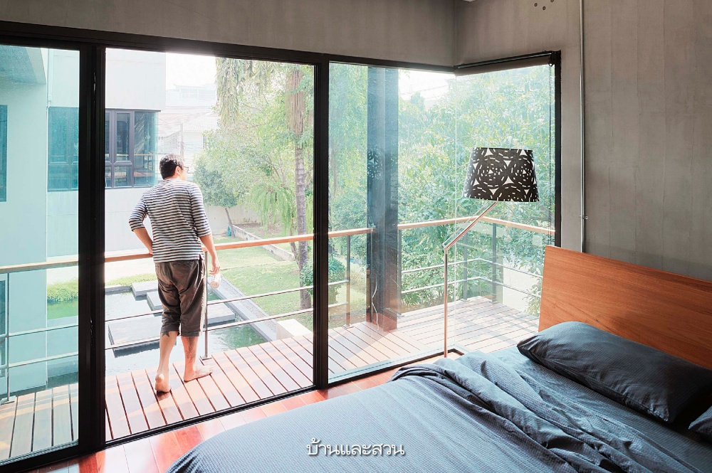บนชั้นสองออกแบบบริเวณห้องนอนให้วางตัวเหมือนห้องชุดในคอนโดที่มีความเบ็ดเสร็จในตัวเอง มีฟังก์ชันเหมือนบ้านเล็กๆ อีกหลังหนึ่ง แยกส่วนที่นอนส่วนแต่งตัว ส่วนนั่งเล่น และห้องน้ำออกจากกัน แต่เดินถึงกันได้ด้วยระเบียง