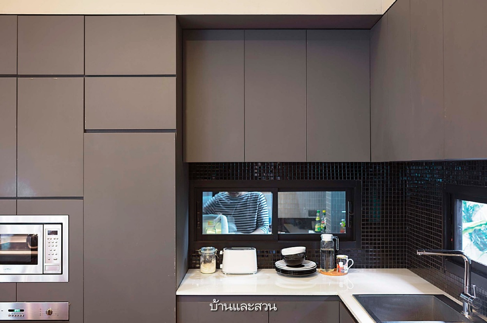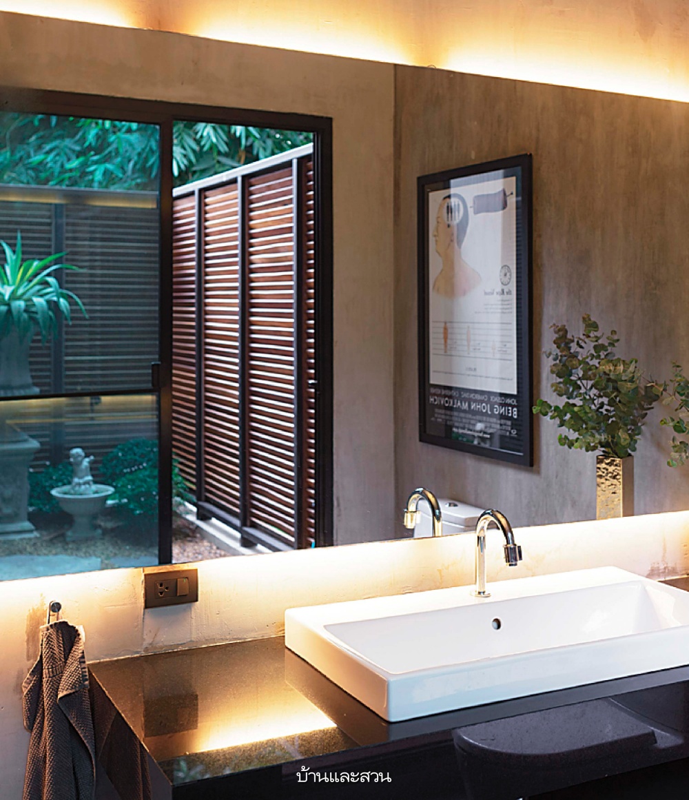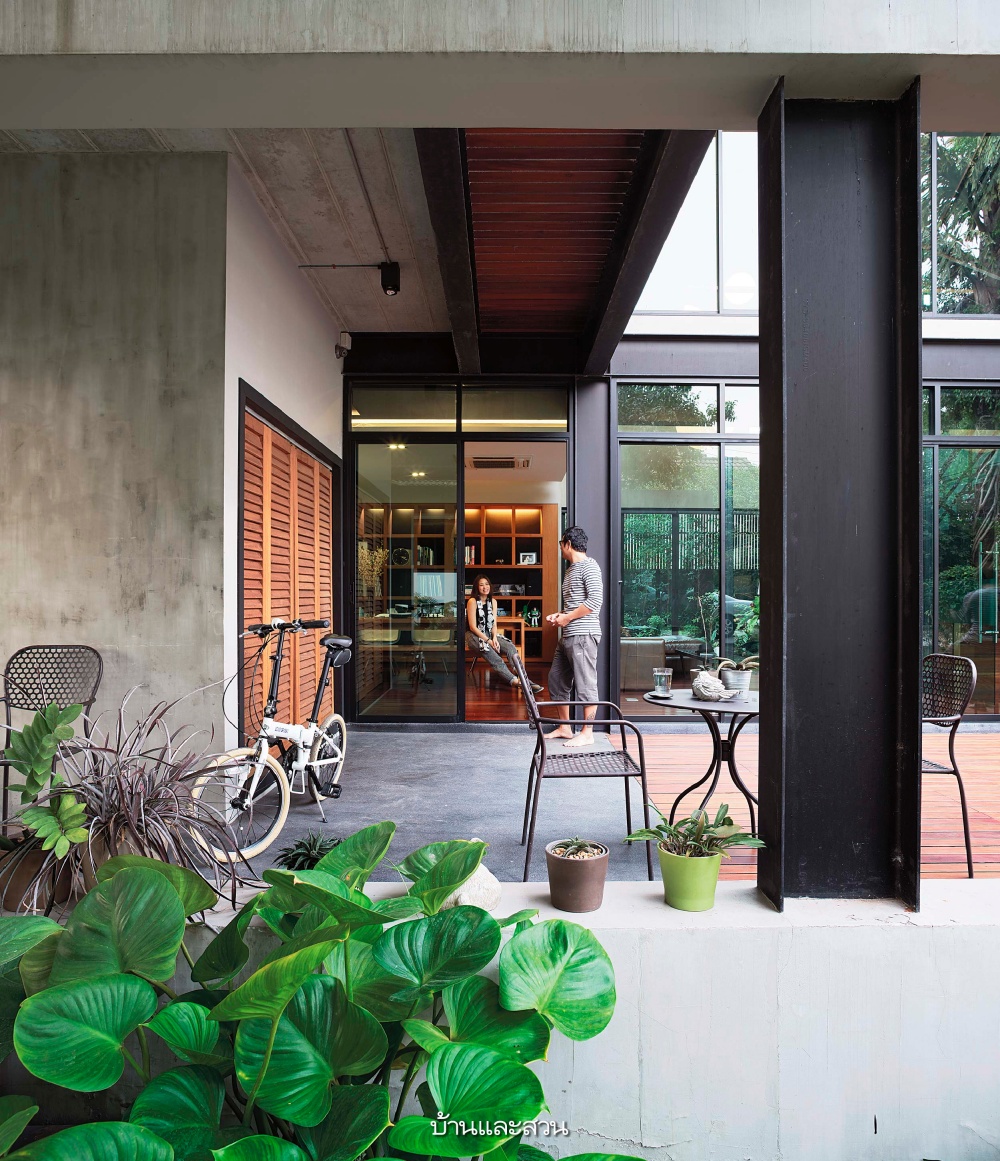ต้นไม้ในพื้นที่ก็เป็นสิ่งที่เจ้าของบ้านพยายามเก็บรักษาไว้ให้มากที่สุดเพราะคุณพ่อคุณป้องปลูกและดูแลมาตั้งแต่ยังเป็นต้นกล้า เช่น ปาล์มน้ำมันขนุน และมะม่วง ช่วยให้บรรยากาศรอบบ้านดูร่มครึ้มสบายตา แม้คุณป้องจะทำงานเป็นผู้กำกับภาพยนตร์โฆษณาและเป็นเจ้าของ Production House ชื่อ Stripper Films ซึ่งต้องออกกองทำงานแทบทุกวัน แต่เขาก็ยังชอบปลูกต้นไม้และทำกิจกรรมต่างๆ ร่วมกับครอบครัว โดยเฉพาะการปลูกเฟินที่มีให้เห็นเกือบทุกมุมของบ้าน