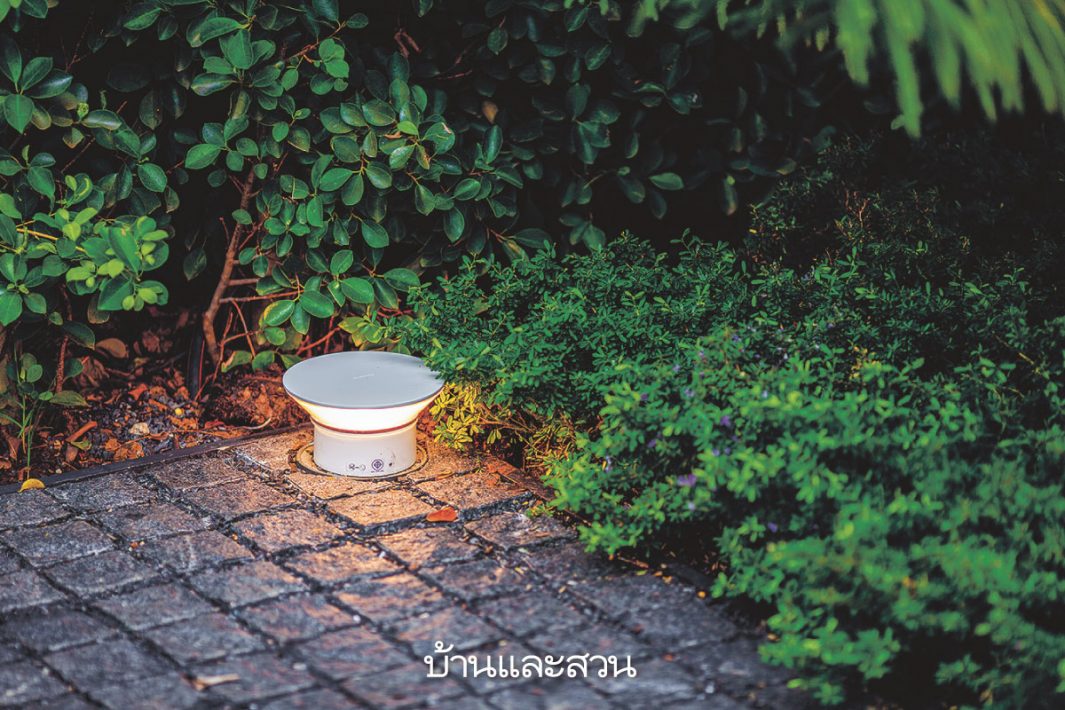 “ตอนได้โจทย์จากคุณฟ้า เราสนุกมากกับการนำความต้องการด้านการใช้งานจริงและความเป็นเทพนิยายในฝันมาหลอมรวมให้กลายเป็นสวนแห่งนี้ ไม่ว่าจะเป็นการเลือกใช้พรรณไม้หลากหลายประเภทที่มีเอกลักษณ์เฉพาะตัว บ่อน้ำพุที่สามารถนั่งเล่นริมขอบบ่อได้ ทั้งยังซ่อนไฟสำหรับให้แสงสว่างในตอนกลางคืนที่เหมือนกับเปลวไฟในน้ำ หรือแม้แต่การออกแบบศาลาเดย์เบดที่ถึงแม้ว่าเราจะเลือกใช้รูปทรงสี่เหลี่ยมดูมินิมัล แต่ก็มีรายละเอียดของการกรุกระเบื้องนูนต่ำสีขาวที่ก่อเรียงทำมุม 45 องศาเหมือนฟันปลา ให้ความรู้สึกถึงเหลี่ยมมุมของปราสาทสไตล์กอทิกที่มักเห็นในการ์ตูน”