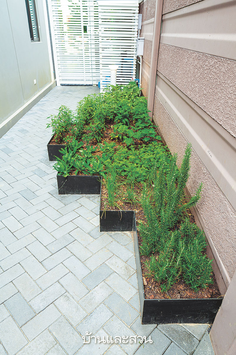 โจทย์ที่ท้าทายอีกอย่างคือ เจ้าของไม่ต้องการเห็นสิ่งแปลกปลอมเมื่อมีการนั่งพักผ่อนภายในสวน รวมไปถึงรถยนต์ที่จอดอยู่ในโรงจอดรถด้านข้าง ดังนั้นแทนที่จะปลูกต้นไม้เป็นรั้วเพื่อบังสายตาแบบที่นิยมทำกัน คุณพลอยได้ออกแบบกระบะปลูกหญ้าให้สูงขึ้นจากพื้นประมาณ 30 เซนติเมตร และเล่นระดับสูงต่ำเป็นขั้นบันไดที่สามารถเดินหรือนั่งเล่นได้ ทำให้สวนที่มีขนาดไม่ใหญ่มากดูกว้างสบายตาและไม่รู้สึกอึดอัด นอกจากนี้ยังมีระบบสปริงเกลอร์ที่พ่นหมอกให้ความชุ่มชื้นแก่สนามหญ้าและสร้างบรรยากาศชวนฝันยิ่งขึ้นไปอีก
