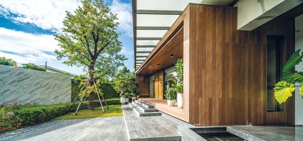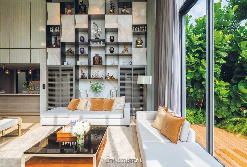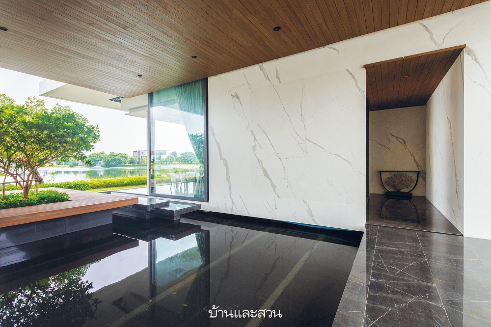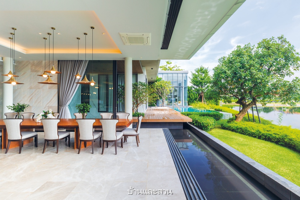 “เจ้าของบ้านชอบบ้านแบบทรอปิคัลโมเดิร์นที่เน้นให้ดูแลรักษาง่าย กันแดดกันฝนได้ดี บ้านริมบึงแบบนี้ แม้จะเปิดโล่งแต่ก็ไม่เสียความเป็นส่วนตัว จึงเน้นความต่อเนื่องกับพื้นที่ริมน้ำซึ่งเป็นทะเลสาบส่วนตัวของโครงการที่มีการทำกำแพงกันดินแล้ว จึงสามารถสร้างบ้านห่างจากเขตที่ดินได้ตามปกติ ออกแบบแนวพุ่มไม้แทนการทำรั้ว สร้างมุมมองให้ดูกว้างต่อเนื่องกับธรรมชาติ มีเรื่องที่ต้องระมัดระวังคือสัตว์และแมลงที่อาจมากับน้ำ จึงเลือกใช้ระบบประตูที่ปิดได้สนิท ส่วนภายในบ้านตกแต่งสไตล์คลาสสิกร่วมสมัยให้เข้ากับของสะสมซึ่งเป็นตุ๊กตาเคลือบจากต่างประเทศ จึงเน้นโทนสีครีมและโทนสีนิวทรัลที่ดูสบายตา”