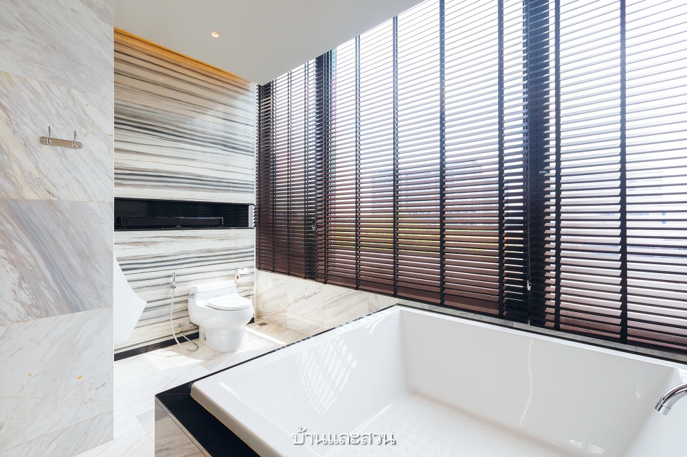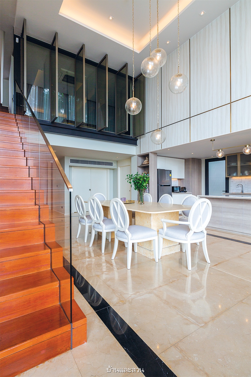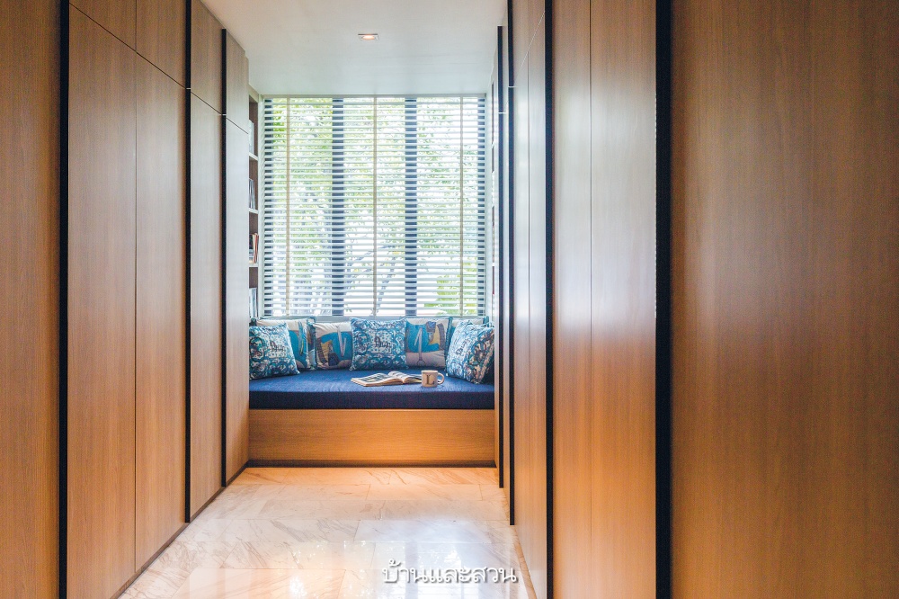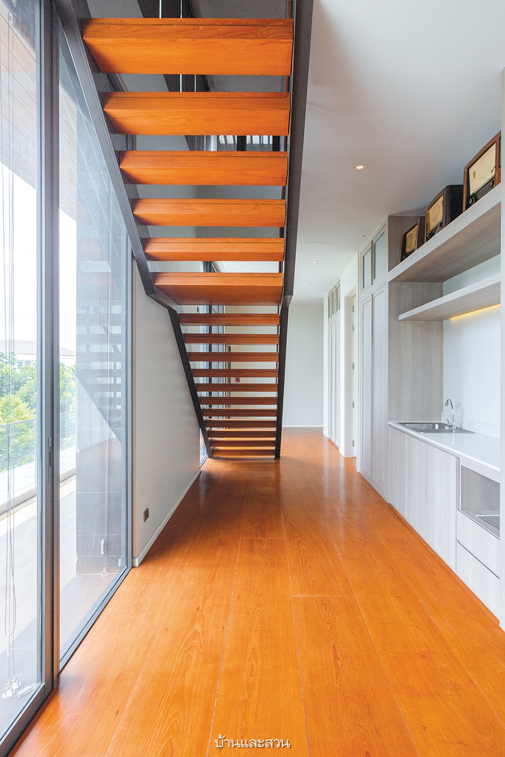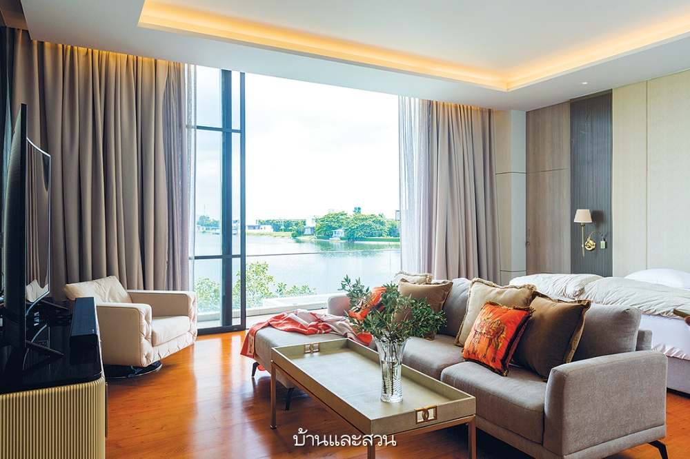 เมื่อบ้านอยู่ในทำเลที่ดีแล้ว สถาปนิกจึงออกแบบการใช้พื้นที่ให้เต็มศักยภาพ “มีการออกแบบให้เปิดรับลมธรรมชาติได้ ทุกห้องจึงสามารถอยู่ได้โดยไม่จำเป็นต้องใช้แอร์ตลอดเวลา มีการเชื่อมต่อพื้นที่ระหว่างภายนอกกับภายในแบบ Inside-out และ Outside-in ที่เชื่อมต่อทั้งสเปซและมุมมอง ทำให้แม้จะนั่งอยู่ภายในบ้านก็เสมือนนั่งเล่นอยู่ในสวนริมน้ำที่แวดล้อมด้วยธรรมชาติได้ ห้องรับรองออกแบบให้มีหน้ากว้างกว่า 10 เมตร ส่วนห้องนั่งเล่นในโซนพักผ่อนจะได้หน้ากว้างไม่มาก แต่ทำห้องยื่นออกไปให้เปิดมุมมองกว้างได้สองด้าน รูปทรงบ้านโดยรวมเป็นทรงสี่เหลี่ยม แต่ออกแบบให้มีการคั่นด้วยพื้นที่ว่างเพื่อแยกกลุ่มห้องออกจากกันให้เปิดมุมมองได้กว้างขึ้น”