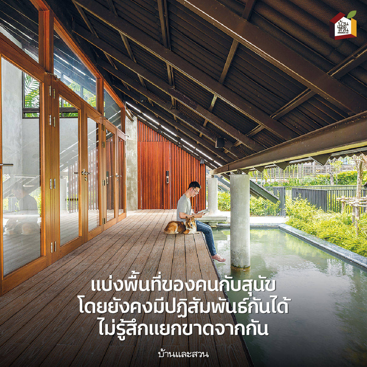 โจทย์ตั้งแต่แรกของบ้านหลังนี้คือ การแบ่งพื้นที่เป็น 3 ส่วนที่มีการจัดการอย่างดี ได้แก่ พื้นที่ใช้ร่วมกันของคนและสุนัข พื้นที่สำหรับสุนัข และส่วนพักอาศัยของคน เพื่อให้คนและสุนัขนับ 10 ตัว มีความสุขร่วมกันในบ้าน สัดส่วนที่นำมาออกแบบจึงไม่ได้มีแค่สัดส่วนของคนเท่านั้น หากยังนำสัดส่วนของสุนัขเข้ามาคิดด้วยเช่นกัน อาทิ ความสูงของชายคากับมุมมอง การเปิดช่องให้สุนัข ระบบนิเวศที่ทำกิจกรรมร่วมกัน รวมไปถึงระบบสุขาภิบาลที่ดูแลง่าย >>อ่านต่อ