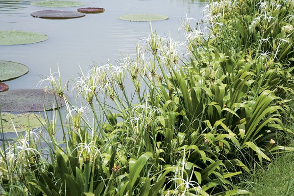 ลักษณะ มีลำต้นใต้ดินเป็นหัวแบบเผือก โตเป็นพุ่มสูงประมาณ 60 เซนติเมตร ใบรูปหอก มีช่อดอกเป็นกระจุก สีขาว โคนกลีบดอกเชื่อมติดกันเป็นหลอดยาว ปลายแยกเป็น 6 แฉก มีกลิ่นหอมอ่อนๆช่วงเช้า ออกดอกตลอกทั้งปี เจริญเติบโตไดในดินทุกประเภท ชอบแสงแดดตลอดวัน ทนแล้ง นิยมปลูกริมน้ำหรือตามซอกหินน้ำตกตามสไตล์สวนเมืองร้อน