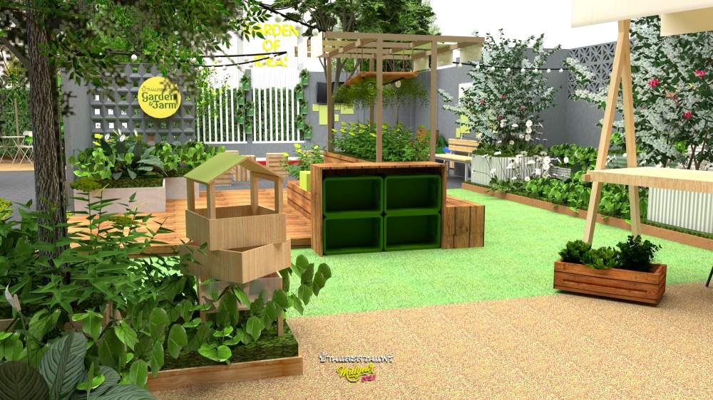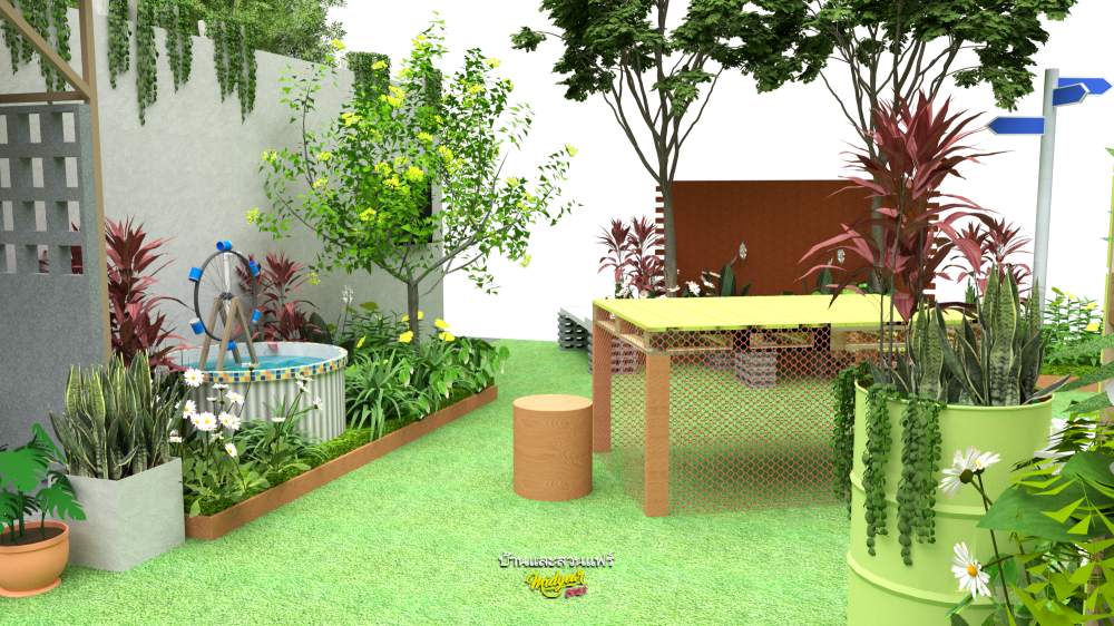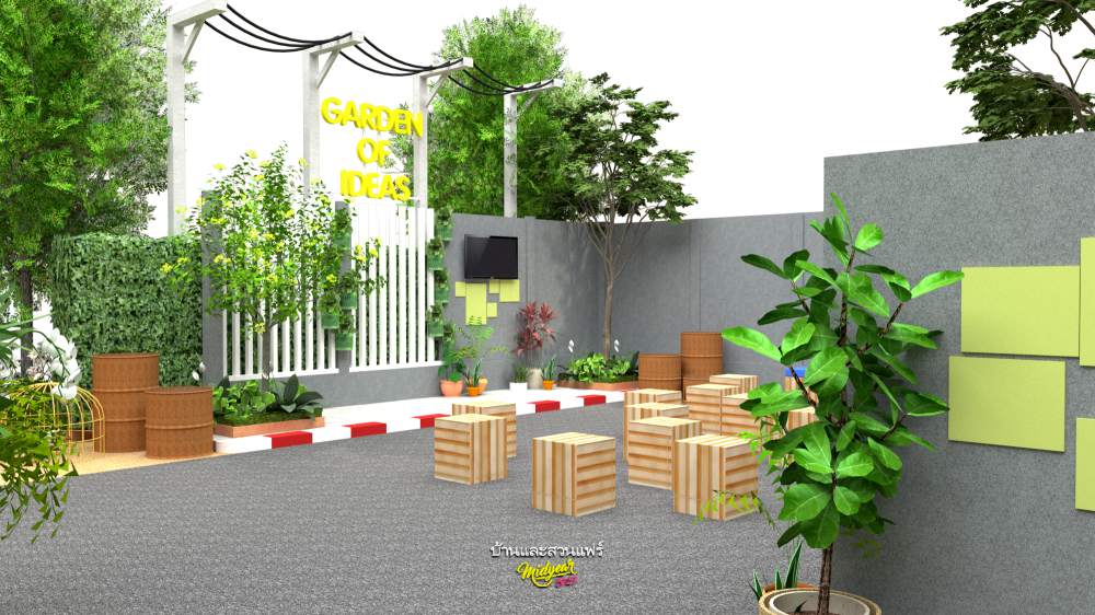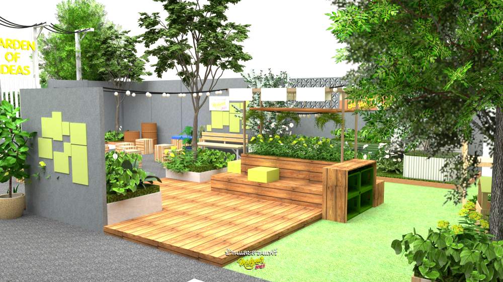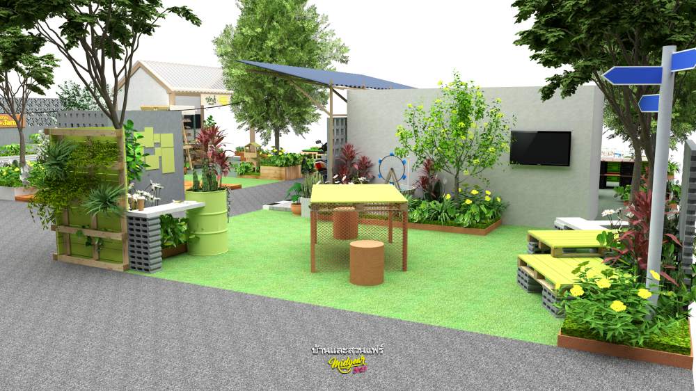 พื้นที่รกร้างที่เปลี่ยนเป็นลานอเนกประสงค์ ไอเดียที่นั่งจาก คุณโจ้ – คมกฤต สุขทอง นักจัดสวนจาก คนสวน Landscape นำเสนอไอเดียจากไม้พาร์เล็ตและถังน้ำมันเก่าให้กลายเป็นที่นั่งรูปแบบต่างๆ และไอเดียลูกเล่นจากวงล้อจักรยานกลายมาเป็นผนังน้ำล้น จาก คุณแฮม – ญาดา สิบธง และคุณแชมป์ จุลพรรษา จันทรไพโรจน์ นักจัดสวนจากMayuree Garden Garden & Landscape Design