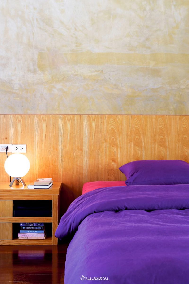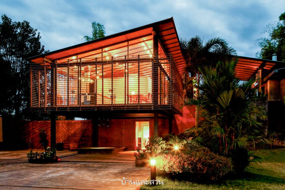 บ้านไม้โมเดิร์นใต้ถุนสูง กลางสวน ที่เกิดจากความต้องการของเจ้าของบ้านที่ชื่นชอบบ้านที่มีพื้นที่ใช้สอยชั้นเดียว มีแสงไฟสวยๆ ไม่ต้องมีบันได โปร่งโล่ง ไม่อึดอัด และสามารถมองเห็นบรรยากาศภายนอกบ้านได้ชัดเจน ที่สำคัญต้องมีผนังสีๆเพื่อไม่ให้บ้านดูเรียบจนเกินไป