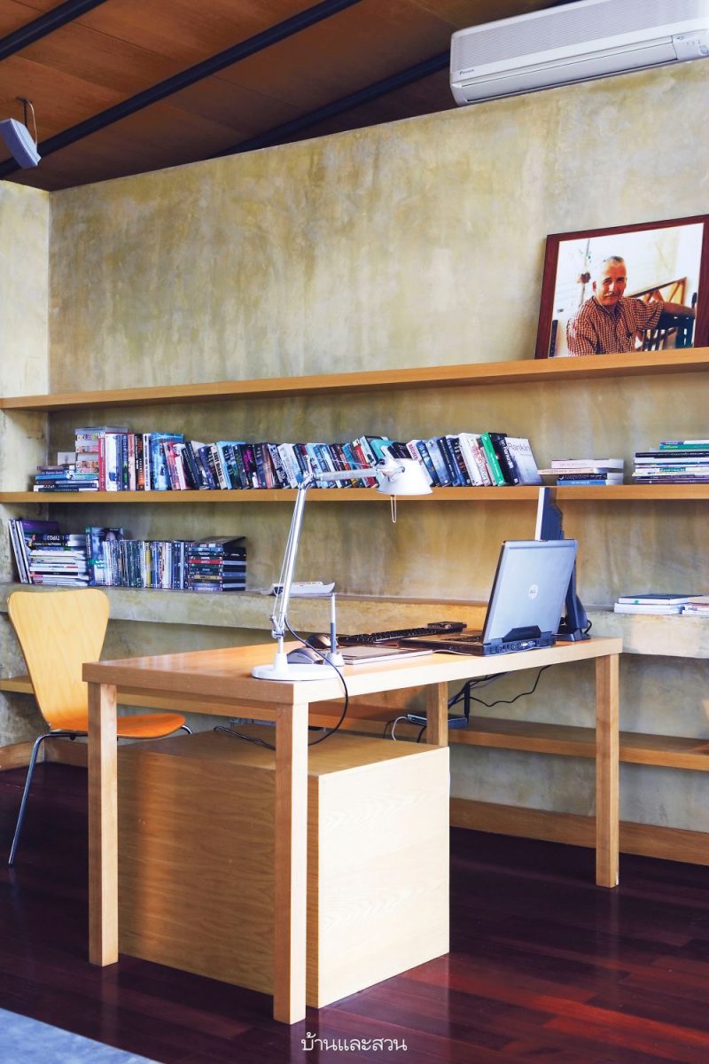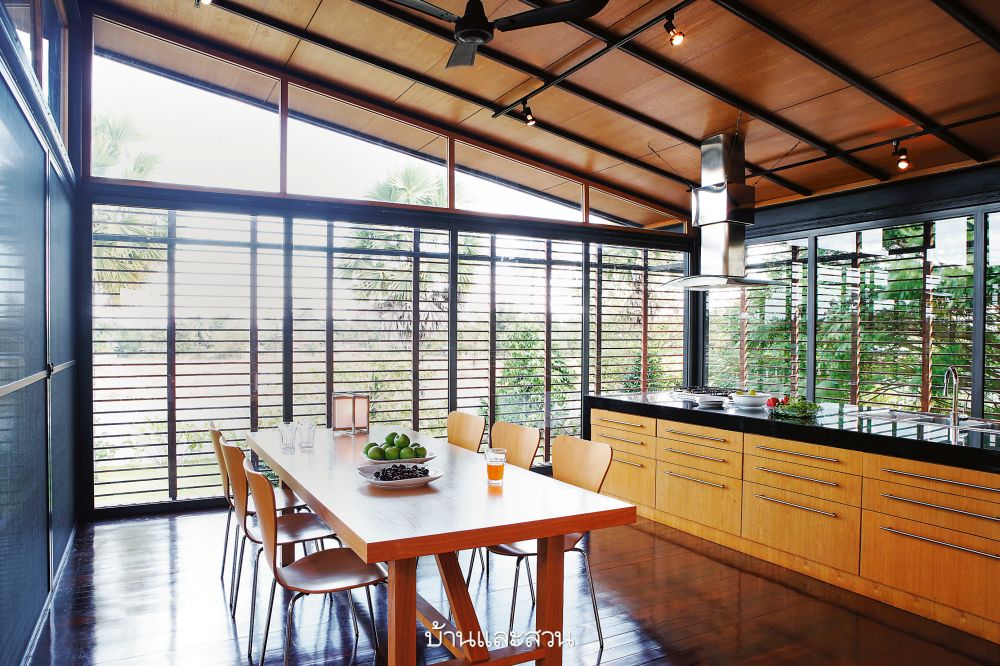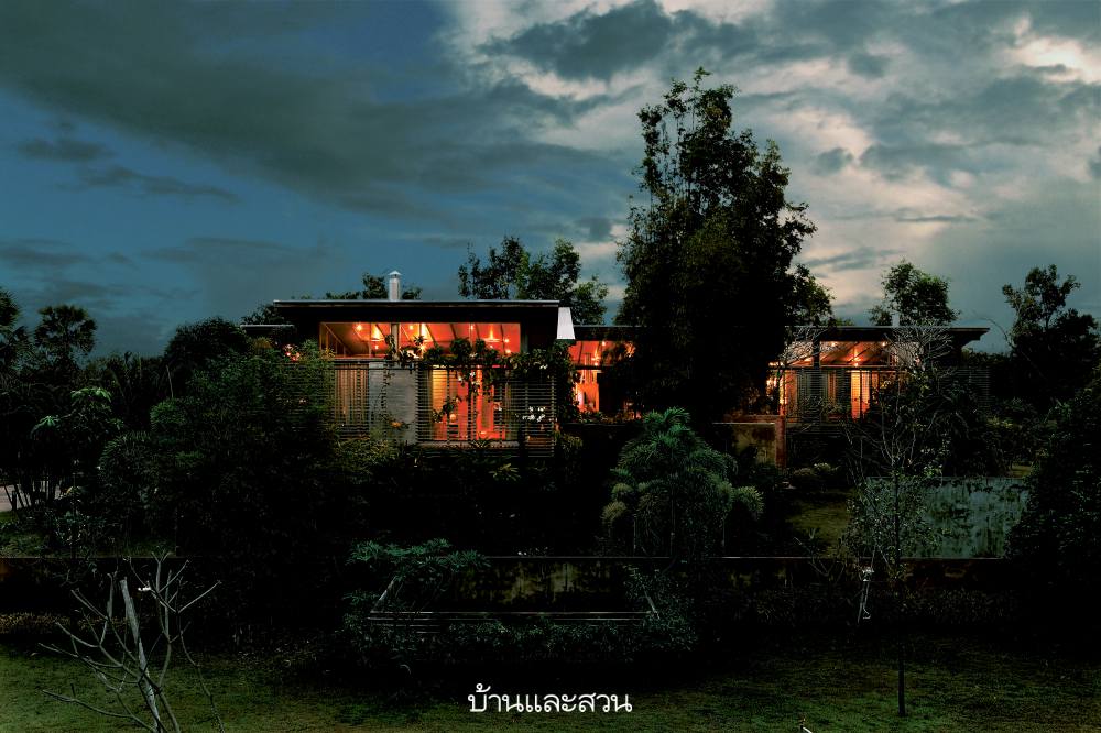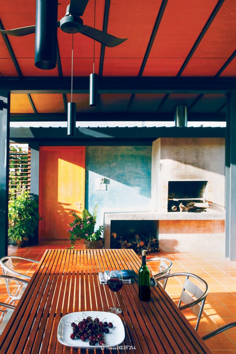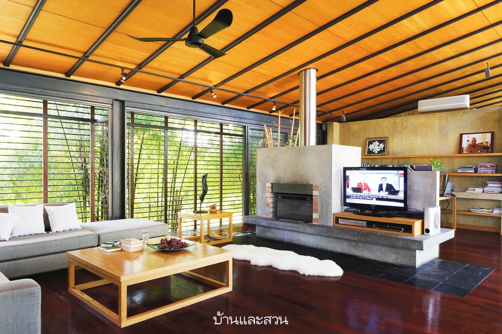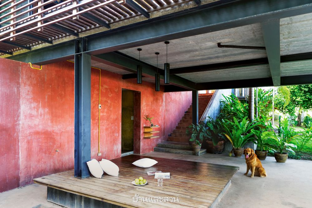 ความโดดเด่นของบ้านหลังนี้อยู่ที่ความเป็นบ้านแบบโมเดิร์น แต่การใช้งานแบบไทย เห็นได้จากใต้ถุนสูงของบ้านที่ใช้เป็นที่เก็บของส่วนหนึ่ง และพร้อมรอรับแขกด้วยที่นั่งเล่นที่ก่อขึ้นจากปูนซีเมนต์ง่ายๆ แล้ววางท็อปด้วยกระดานไม้ เหมือนบ้านไม้มีใต้ถันของชาวบ้านที่จะมีแคร่ไม้ไผ่ไว้รับแขก