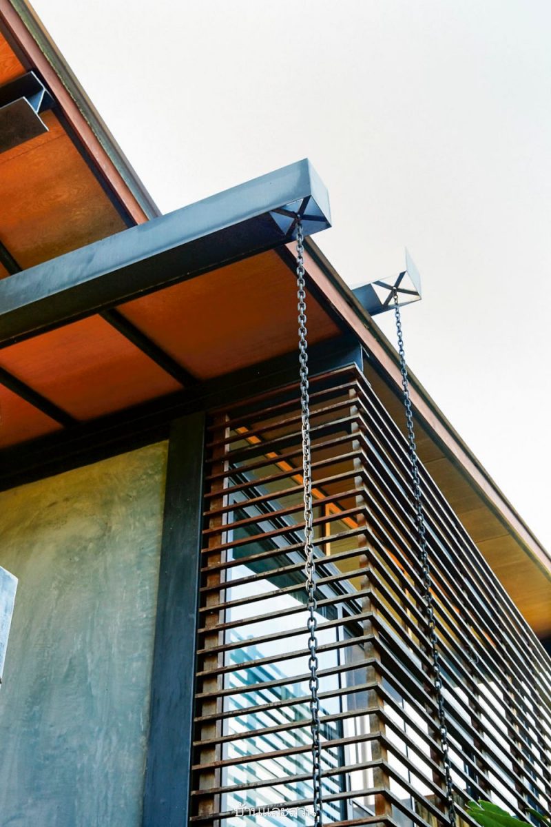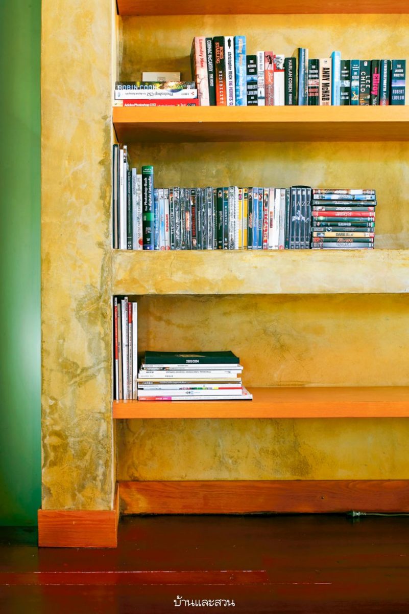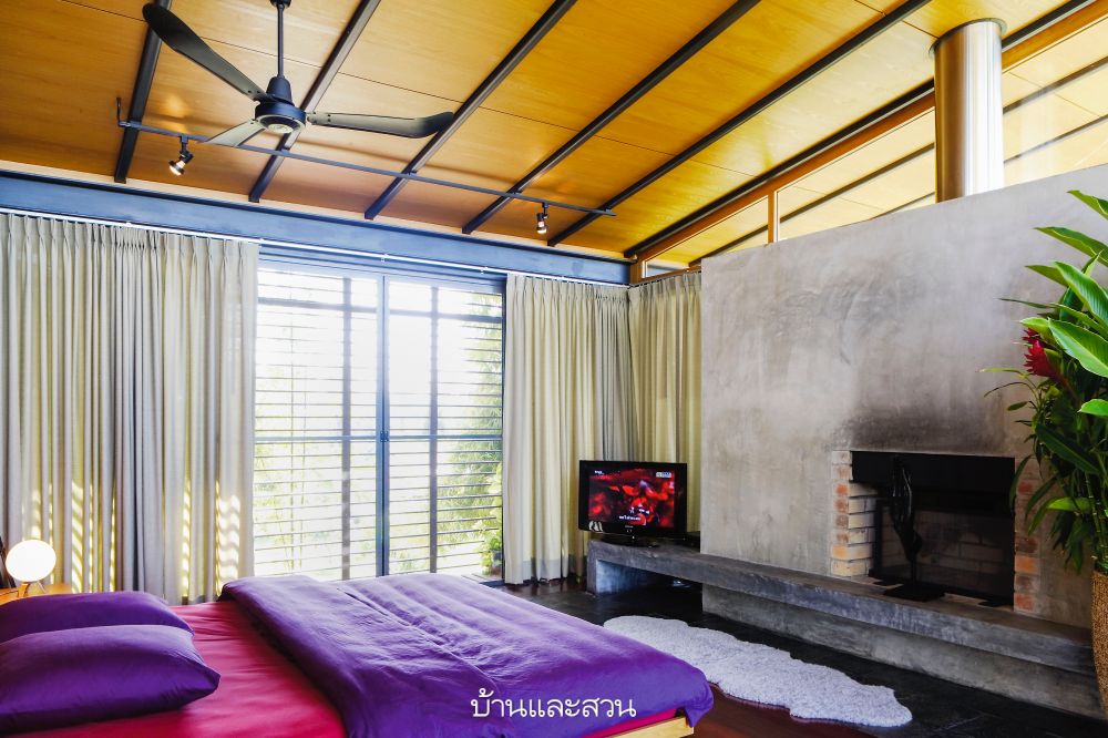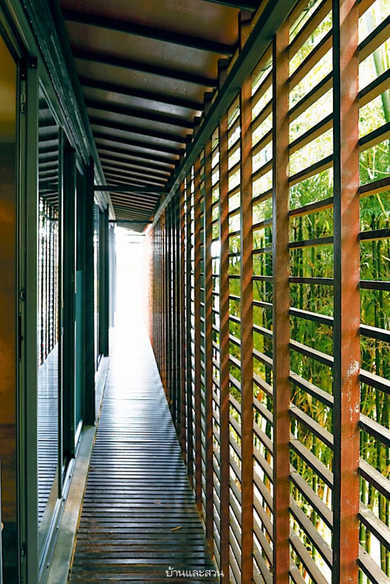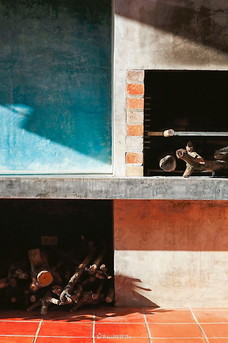 ความโดดเด่นของบ้านหลังนี้อยู่ที่ความเป็นบ้านแบบโมเดิร์น แต่การใช้งานแบบไทย เห็นได้จากใต้ถุนสูงของบ้านที่ใช้เป็นที่เก็บของส่วนหนึ่ง และพร้อมรอรับแขกด้วยที่นั่งเล่นที่ก่อขึ้นจากปูนซีเมนต์ง่ายๆ แล้ววางท็อปด้วยกระดานไม้ เหมือนบ้านไม้มีใต้ถันของชาวบ้านที่จะมีแคร่ไม้ไผ่ไว้รับแขก