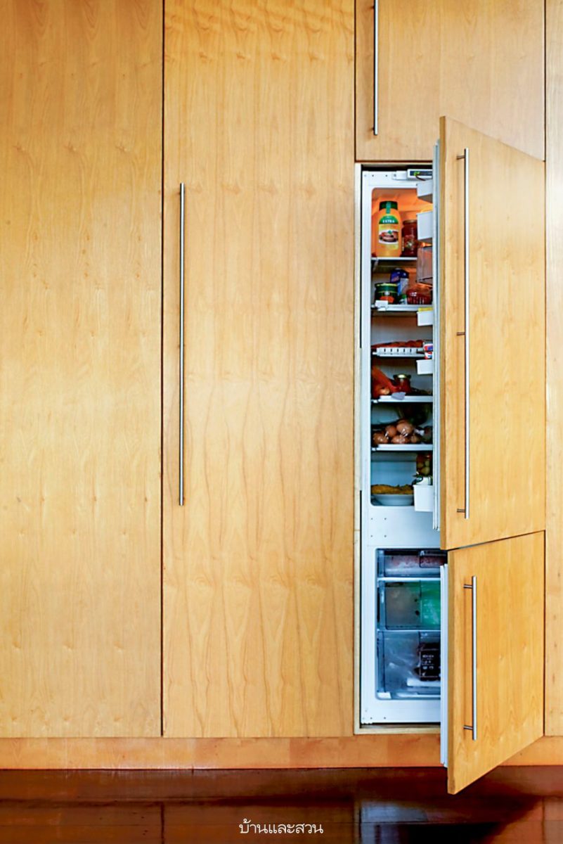 ส่วนของห้องครัวและห้องรับประทานอาหารที่อยู่อีกฝั่งหนึ่งของห้องรับแขกเป็นห้องโล่งๆที่มีแพนทรี่ขนาดกลางวางเป็นเกาะอยู่มุมหนึ่งของห้อง ส่วนผนังด้านที่ติดกำแพงทางผู้ออกแบบได้ออกแบบเป็นตู้บิลท์อินซ่อนตู้เย็นและที่เก็บเครื่องครัวและอาหารได้อย่างมิดชิดสะอาดตา