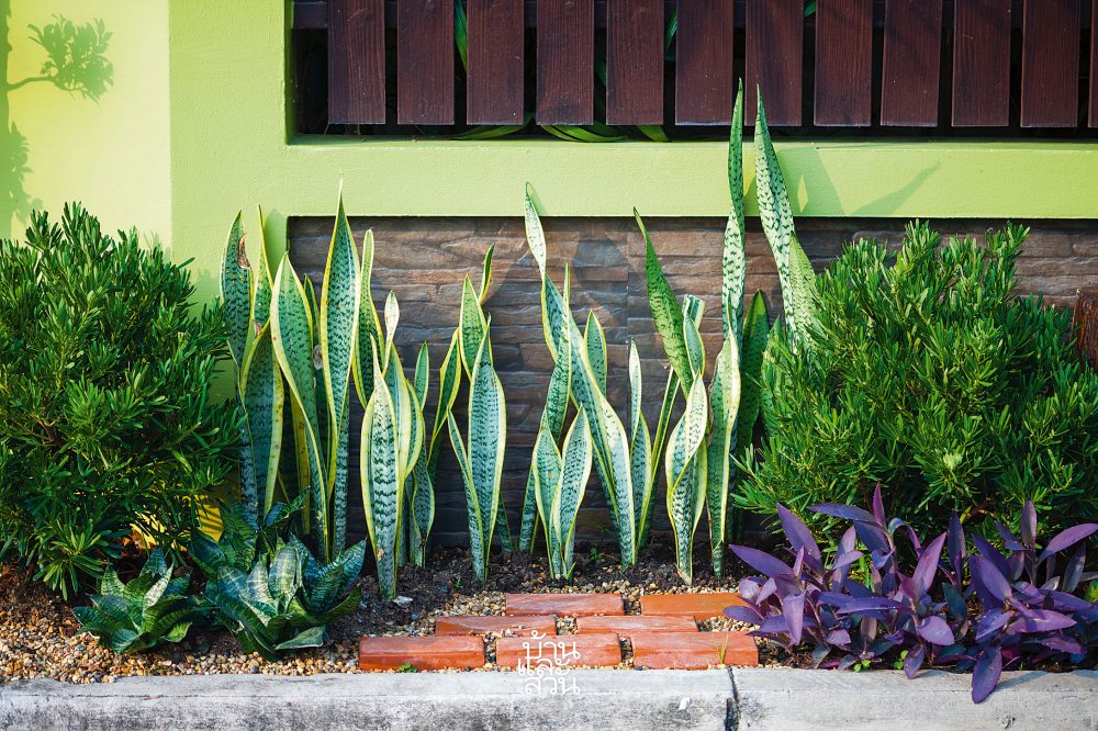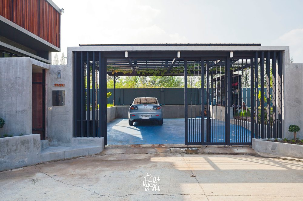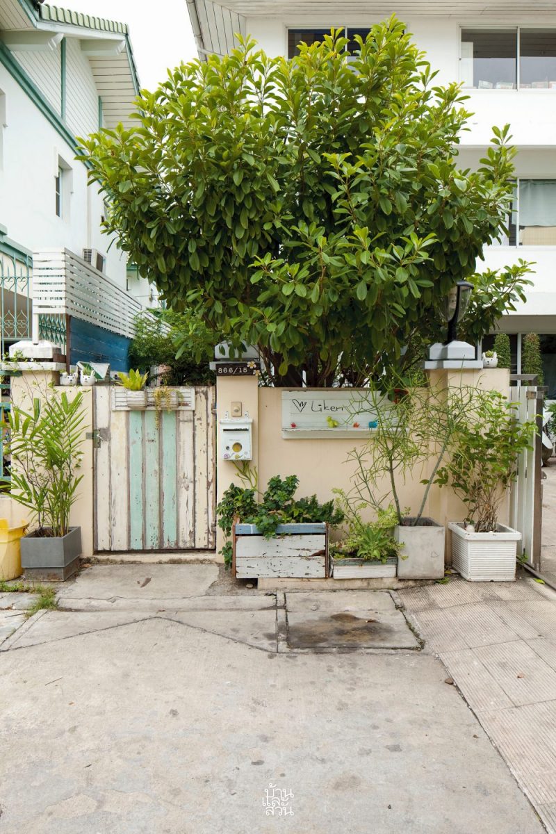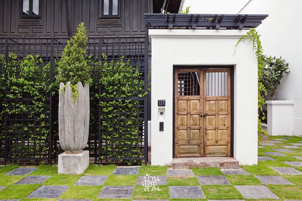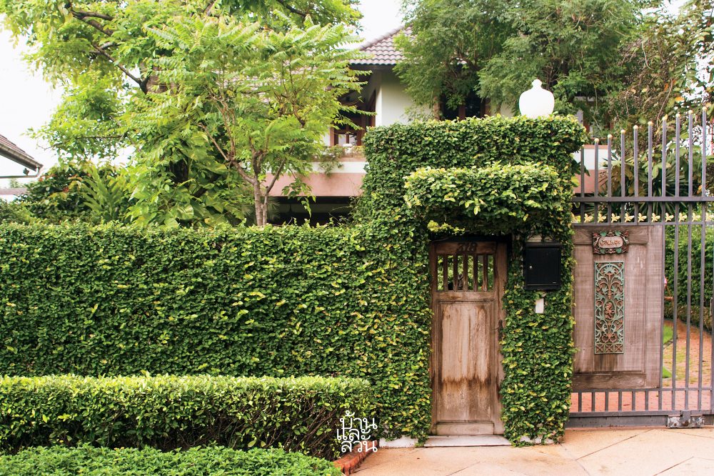 ภายนอกและตัวบ้านให้เห็นอย่างชัดเจน อาจเพิ่มลูกเล่นด้วยการทำระแนงไม้บังแดดไว้ด้านบน แล้วปลูกไม้เลื้อยให้ขึ้นคลุมซุ้มประตู ช่วยเติมความสดชื่นและสีเขียวให้บ้าน