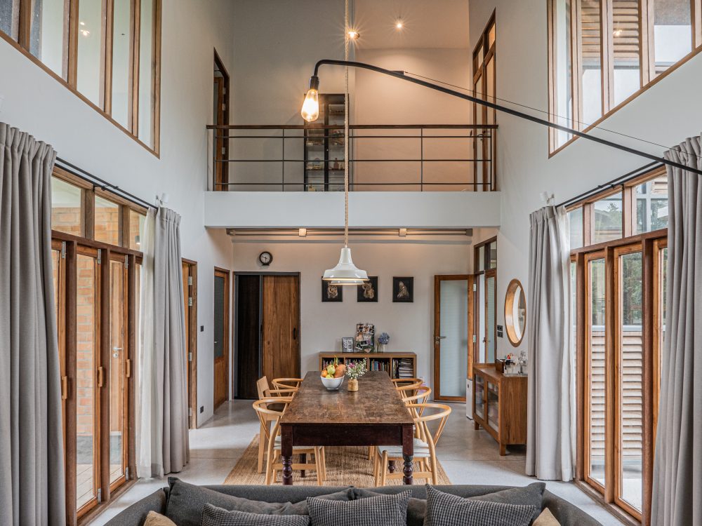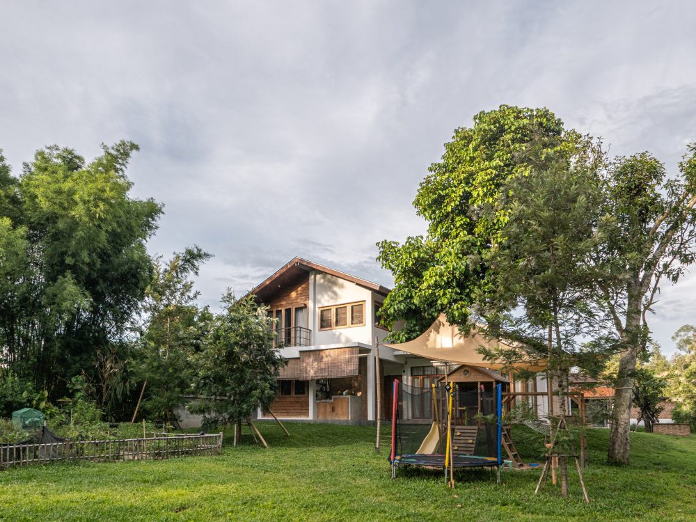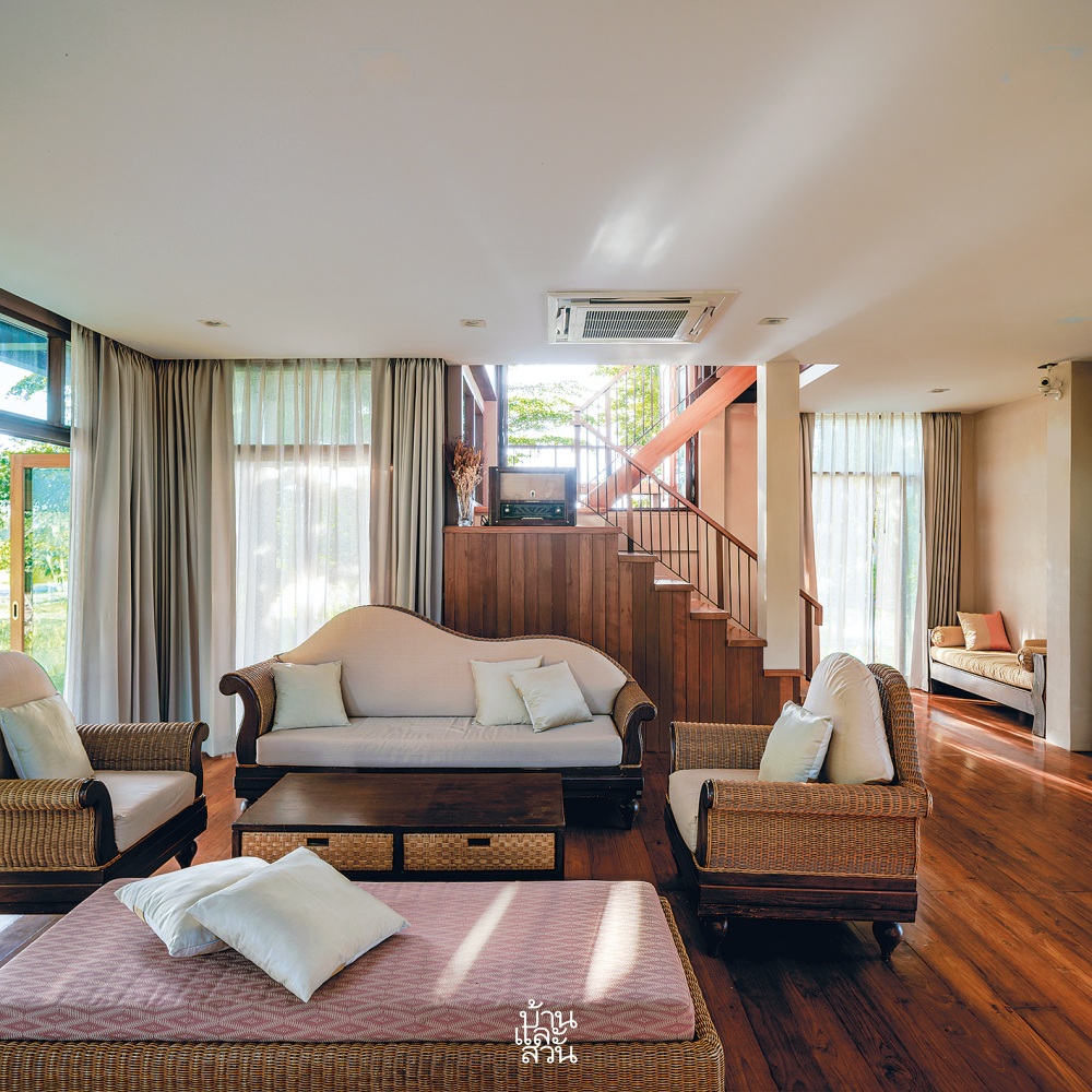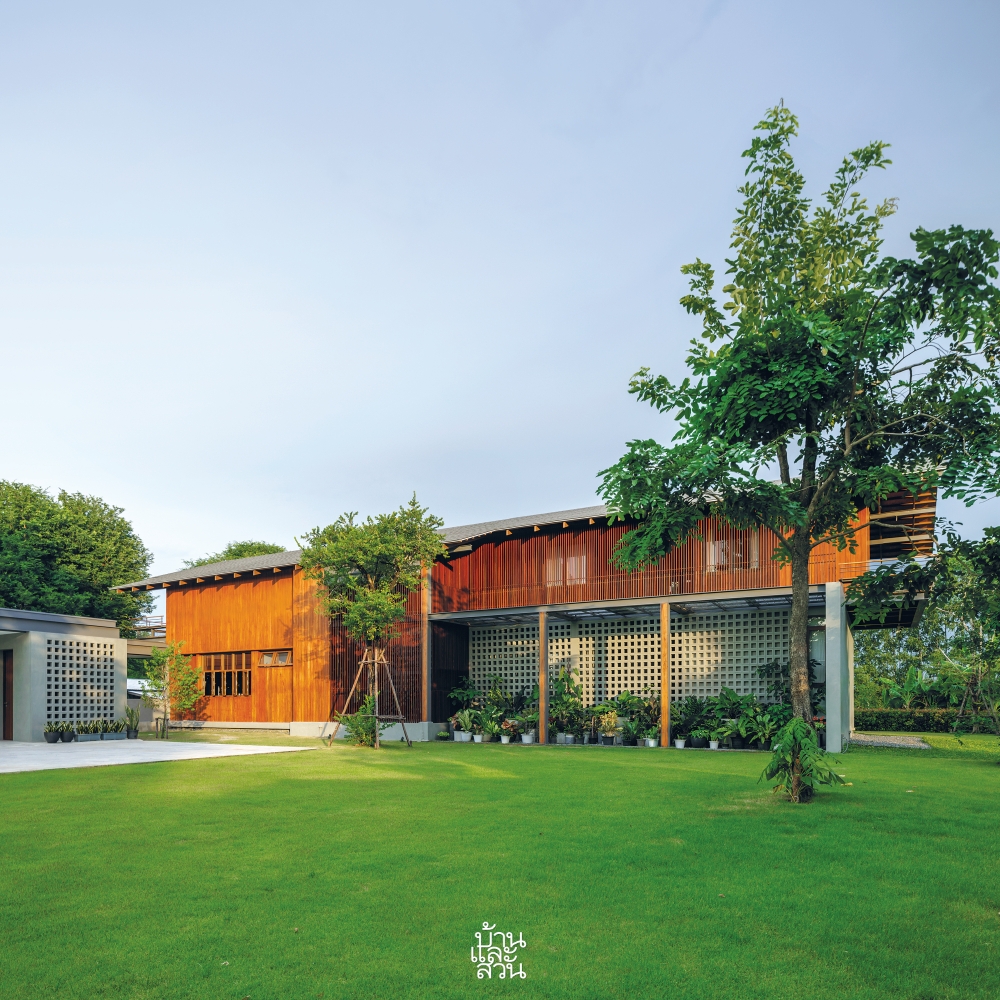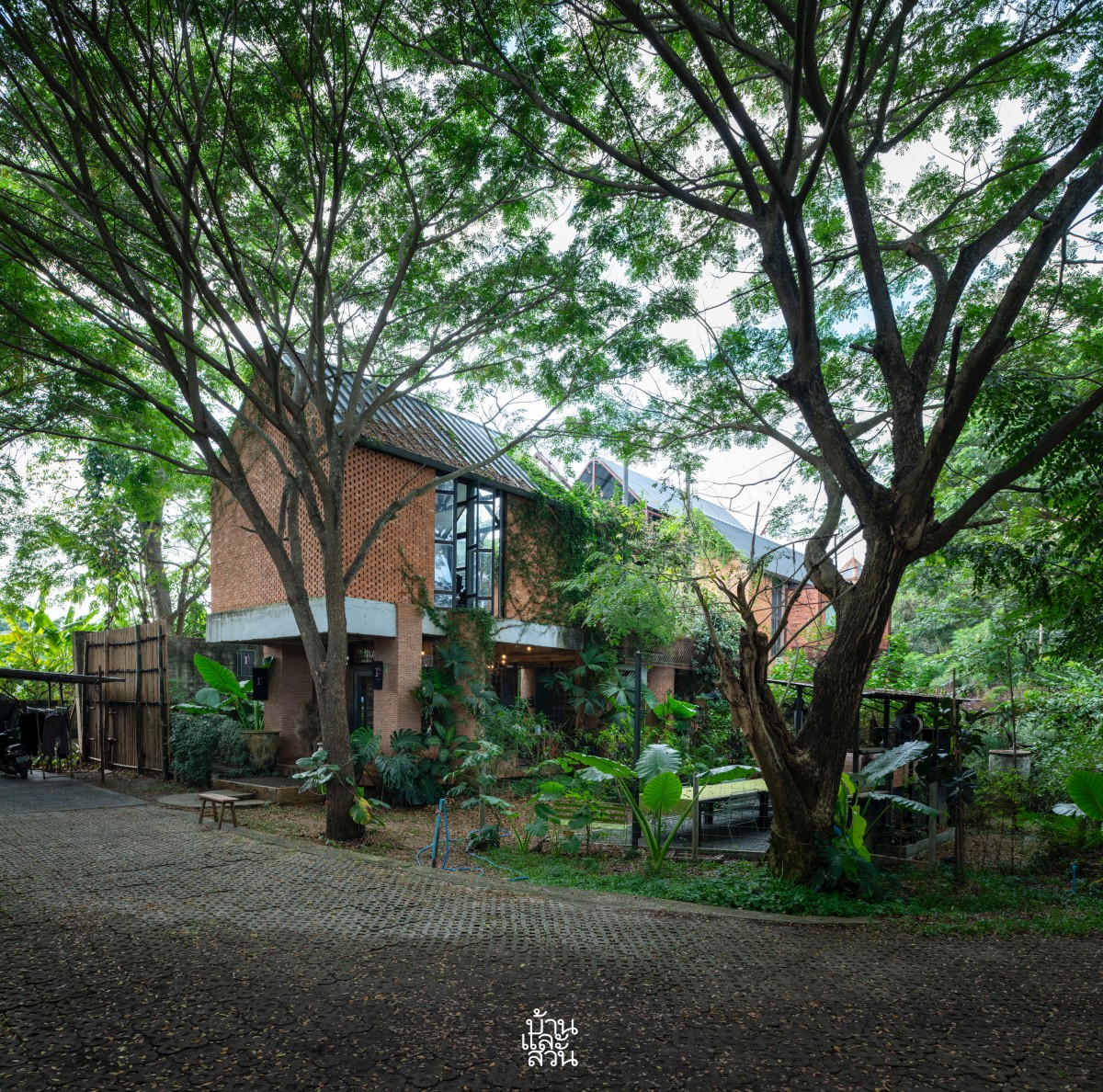 บ้านอิฐใต้ถุนสูงที่ทำใต้ถุนเป็นร้านอาหารแบบเปิดโล่ง ออกแบบบ้านสไตล์ทรอปิคัลผสมผสานตะวันออกและตะวันตก ท่ามกลางสวนสุดชิล บ้านขนาดพื้นที่ใช้สอยประมาณ 300 ตารางเมตร แทรกตัวอยู่ท่ามกลางธรรมชาติบนที่ดิน 2 ไร่ ที่มีทั้งแปลงปลูกผักสวนครัว แปลงดอกไม้กินได้ที่ใช้จัดแต่งอาหาร และโรงปุ๋ยไส้เดือนที่แยกไปอีกหลัง มีหนองน้ำธรรมชาติที่ร่มรื่นด้วยพรรณไม้ริมน้ำ เจ้าของบ้านวางผังโดยเช็กระดับพื้นดินที่เป็นจุดน้ำท่วมขังและจุดที่ต่ำที่สุด และด้วยพื้นดินเป็นดินเหนียวที่มีความสามารถในการเก็บน้ำ จึงทำการขุดบ่อเพิ่มเพื่อช่วยรับน้ำในฤดูฝน และสร้างระบบนิเวศที่ดีให้ทั้งคนและสรรพชีวิต ซึ่งความร่มรื่นของธรรมชาติยังต่อเนื่องเข้าไปสู่ทุกมุมภายในบ้าน ที่วางผังเป็นแนวยาวแทรกด้วยคอร์ตตรงกลาง ออกแบบให้ต้นไม้เชื่อมพื้นที่ในแต่ละส่วน สร้างความสัมพันธ์ในแนวตั้งและในแนวราบ ทำให้เกิดปฏิสัมพันธ์ระหว่างพื้นที่ คน และธรรมชาติ >> อ่านต่อ