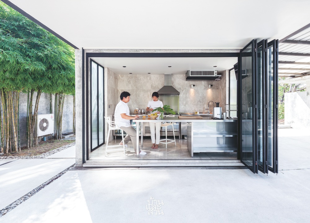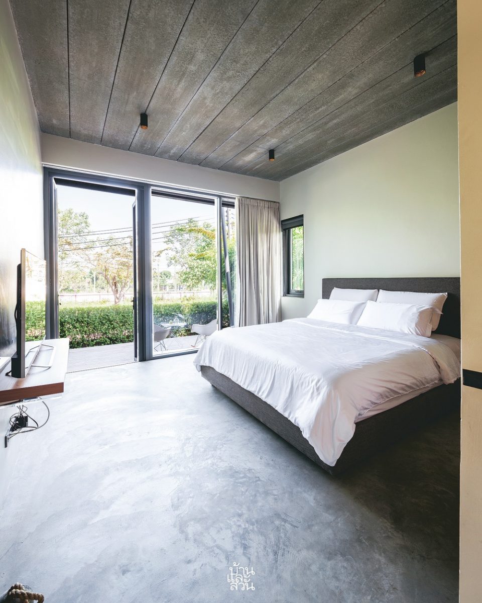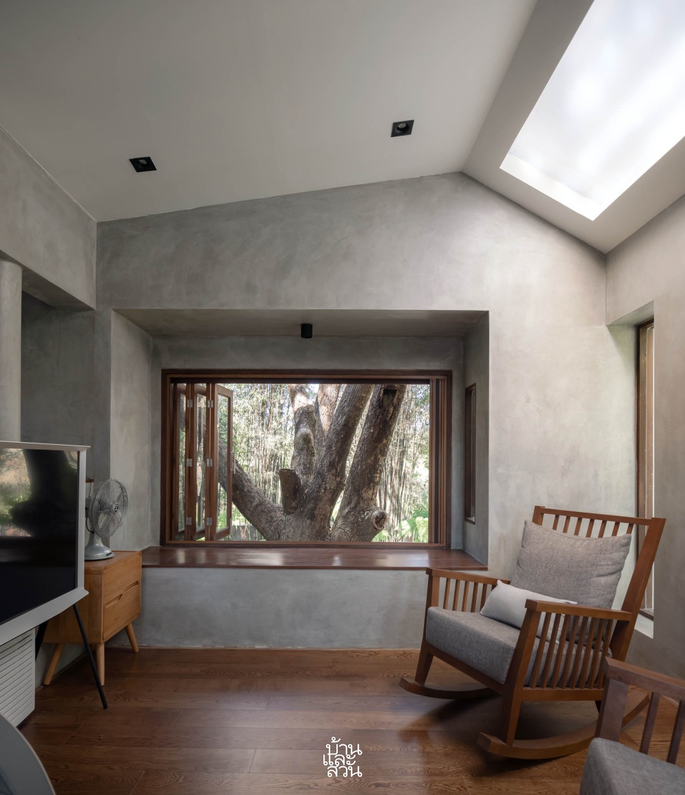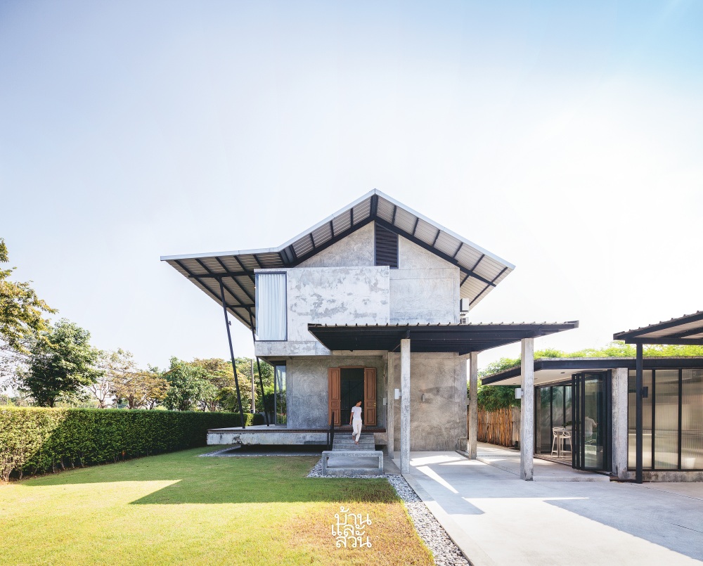 บ้านปูนเปลือยที่ดูดิบสไตล์ลอฟต์ แต่ผสมด้วยหลังคาทรงจั่วแบบไทยเข้ากันได้ดีกับสภาพอากาศร้อนชื้น โดยเลือกใช้เมทัลชีตซึ่งมีน้ำหนักเบากว่าหลังคาทั่วไปและช่วยประหยัดเรื่องโครงสร้างไปได้ แล้วพ่นฉนวนกระดาษไว้ด้านในเพื่อป้องกันความร้อนและดูดซับเสียงรบกวนจากภายนอก ทั้งยังใช้โปรแกรมการคำนวณองศาของหลังคาให้เลี่ยงการซัดสาดของฝน เพิ่มชายคาที่กั้นแนวแสงแดดไม่ให้เข้ามาในบ้าน จึงสามารถนั่งเล่นที่ระเบียงนอกบ้านได้อย่างสบาย ส่วนพื้นที่ภายในบ้านดูเรียบโล่งแบบมินิมัล เป็นบ้านที่ไม่รก ดูแลง่าย และใช้งบก่อสร้างไม่มาก >> อ่านต่อ