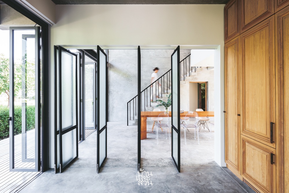 บ้านปูนเปลือยผสมผนังก่ออิฐโชว์แนวบนพื้นที่ 70 ตารางวาหลังนี้แวดล้อมด้วยต้นไม้ใหญ่ เจ้าของบ้านให้โจทย์สถาปนิกว่าอยากได้บ้านโปร่ง เพดานสูง ตัวบ้านยังยกพื้นขึ้นสูง เพราะที่ดินเป็นทางน้ำไหลจึงจำเป็นต้องยกตัวบ้านขึ้นเพื่อหนีน้ำ พร้อมทำช่องหน้าต่างโดยรอบ เพื่อให้แสงและลมเข้าได้ตลอดทั้งวัน ช่วยประหยัดค่าไฟ >> อ่านต่อ