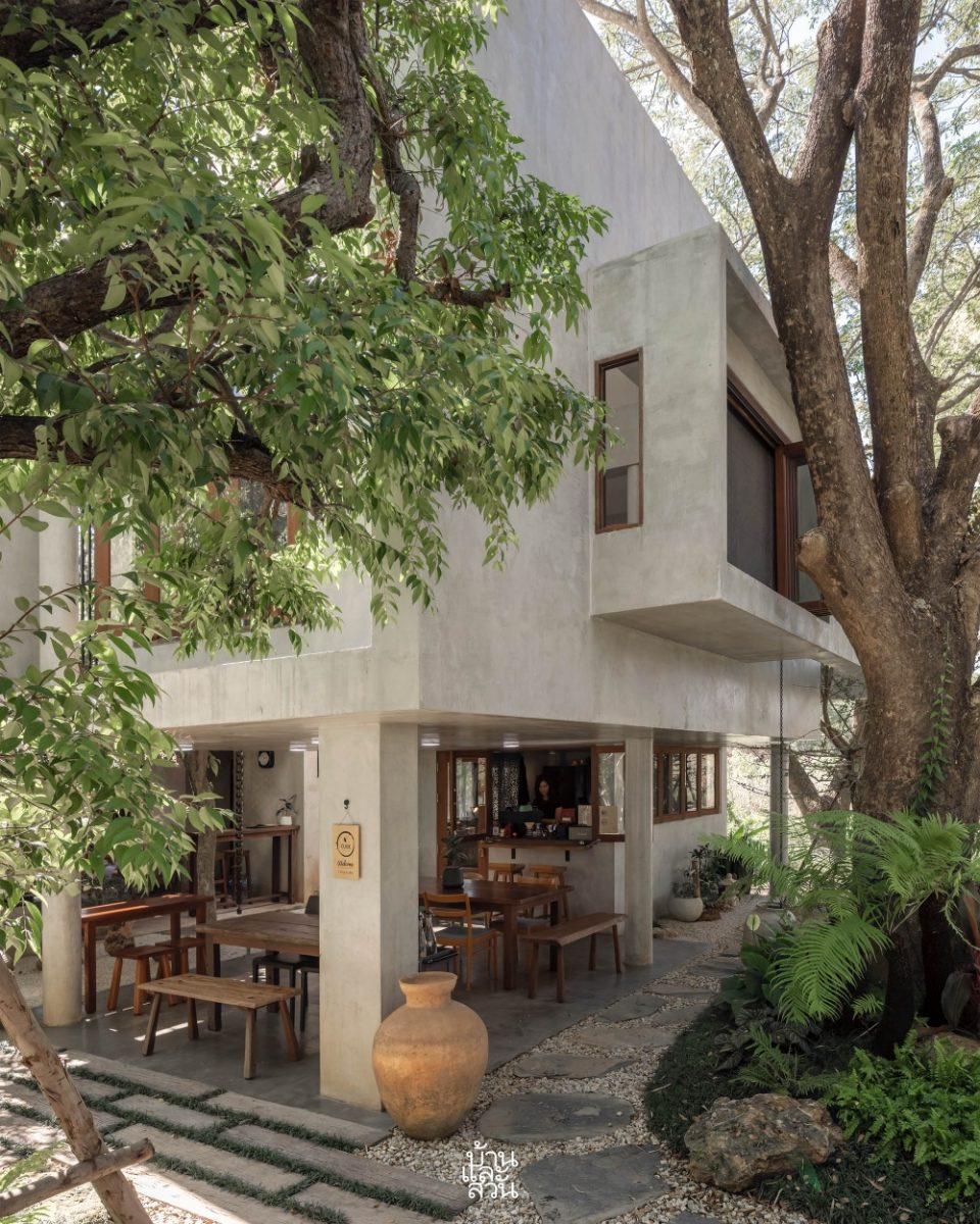 บ้านปูนเปลือยยกใต้ถุนสูงหลังนี้ทำหน้าที่เป็นทั้งบ้านพักอาศัยและคาเฟ่ที่ใช้ชื่อว่า K e p l e r – 2 2 B ในจังหวัดเชียงราย โดยมีแนวคิดการออกแบบที่เคารพต่อธรรมชาติ ไปพร้อมกับการสร้างปฏิสัมพันธ์ภายในครอบครัว เจ้าของบ้านตั้งใจเก็บต้นไม้เดิมในพื้นที่เอาไว้ พร้อมออกแบบให้มีใต้ถุนบ้านเพื่อให้ไม่บดบังทัศนียภาพของธรรมชาติโดยรอบ ส่วนตัวบ้านออกแบบให้เชื่อมโยงกับบ้านหลังเดิมในพื้นที่เดียวกัน ผ่านการเลือกใช้วัสดุไร้การปรุงแต่งอย่างปูนและไม้ในรูปลักษณ์ที่เรียบเท่ขึ้น >> อ่านต่อในหนังสือ “COUNTRY HOUSE บ้านท้องถิ่น วิถีโมเดิร์น”