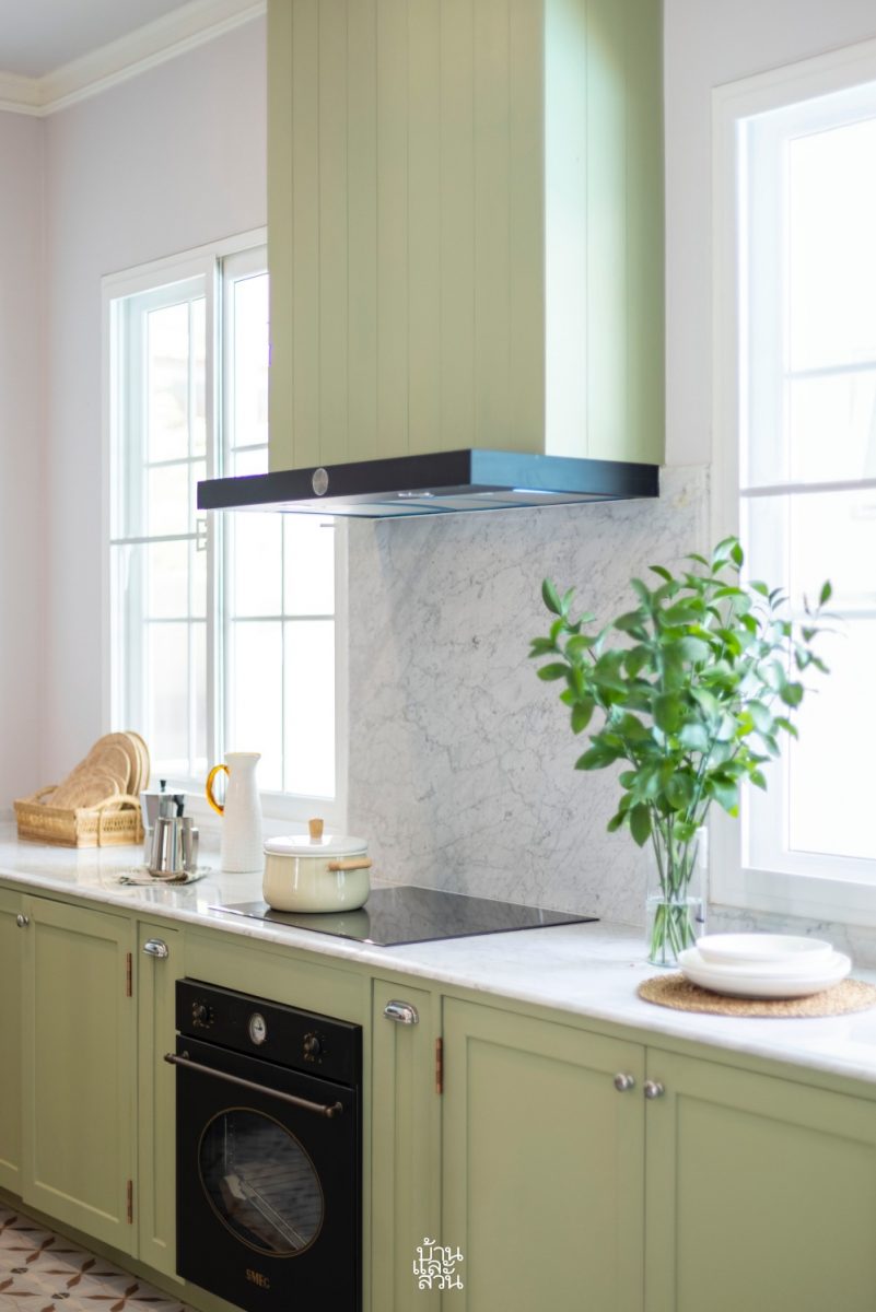 จากแปลนห้องครัวบ้านเดิมที่ออกแบบอยู่เฉพาะด้านนอกเป็นลักษณะครัวเปิด ซึ่งคุณแม่ของคุณอันอยากได้ห้องครัวใหญ่ที่มีพื้นที่เตรียมอาหาร จึงมีการทุบรื้อบางส่วน ขยายพื้นที่แพนทรี่และส่วนรับประทานอาหารให้เชื่อมต่อกัน แล้วค่อยมีประตูต่อไปยังห้องครัว พร้อมเปลี่ยนจากหน้าต่างฝั่งครัวเป็นประตูที่สามารถเข้าจากส่วนจอดรถได้ทันที ทำให้สะดวกเวลาซื้อของสดเข้าบ้าน