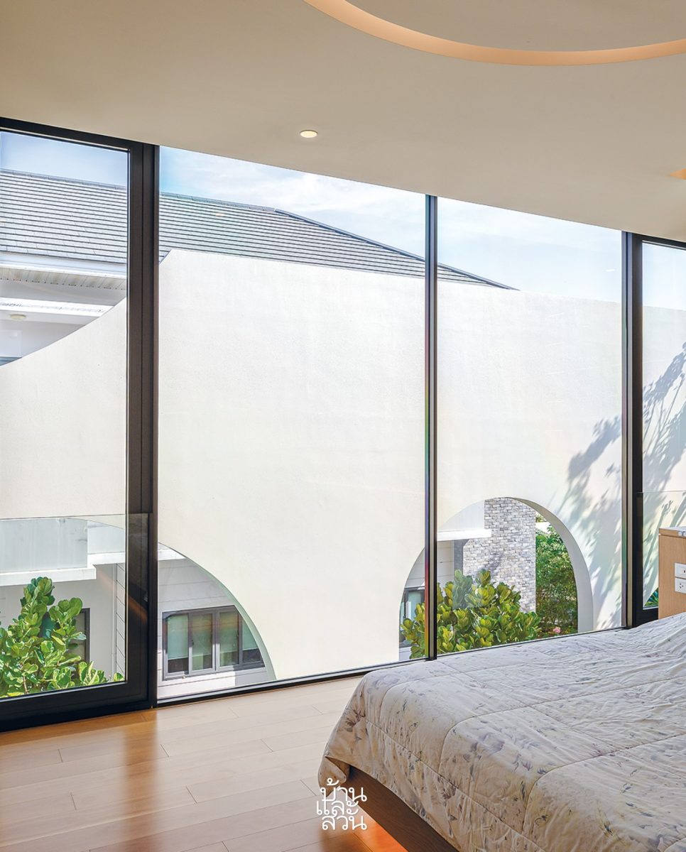 “ผมให้ความสำคัญกับการเชื่อมต่อพื้นที่ระหว่างภายนอกกับภายในอาคารมากๆ เพื่อให้การใช้ชีวิตอยู่ภายในบ้านรับรู้ได้ถึงธรรมชาติภายนอกด้วย ยิ่งใส่พื้นที่สีเขียวเข้าไปมากเท่าไร Ventilation หรือการหมุนเวียนของอากาศก็จะดีขึ้นเท่านั้น โดยบ้านนี้มีสวนคอร์ตอยู่ 2 สวน ก็คือสวนตรงสระว่ายน้ำกับสวนด้านหลังบ้าน แค่วางแปลนโอบล้อมและแทรกไปกับพื้นที่สีเขียวก็สามารถเปิดช่องให้ลมเข้าออกตัวบ้านได้ดีขึ้น แล้วก็เน้นช่องเปิดจากภายในเพื่อส่งสายตาให้มองออกมาถึงสระว่ายน้ำและสวนที่เป็นเหมือนโอเอซิสสำหรับเจ้าของบ้านได้สัมผัสกับมุมมองสบายๆ นี้”