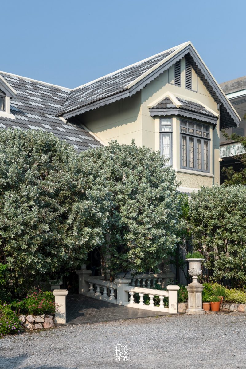 “สวนนี้เราจำลองมาจากสวนในชาโตว์ครับ ซึ่งจะแบ่งสวนออกเป็นโซน สวนฟอร์มัล สวนคอตเทจ และโซนที่เป็นป่า แต่พื้นที่เราเล็กกว่ามาก เลยย่อส่วนทุกอย่างให้เล็กลง ด้านหน้าปลูกไม้ใหญ่ให้ดูเป็นป่า เพื่อบังตาจากบ้านที่อยู่ด้านข้าง ใช้ต้นไม้ตัดแต่งพุ่มกลมเพิ่มความหรูหราในแบบสวนฟอร์มัล ปลูกรวมกับต้นไม้ที่ปล่อยให้โตตามธรรมชาติ หน้าบ้านเป็นแปลงไม้ดอกสไตล์สวนคอตเทจครับ“