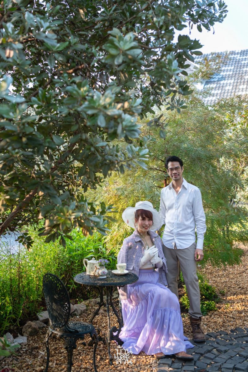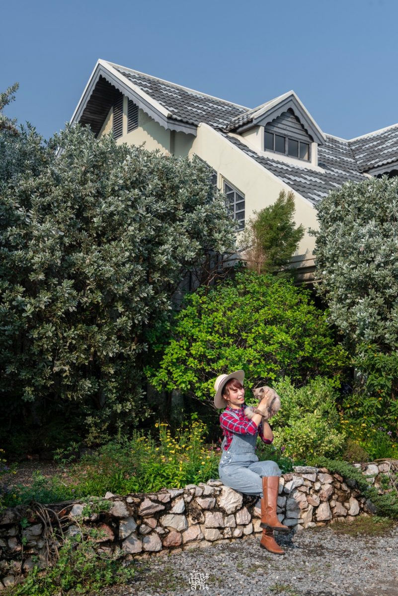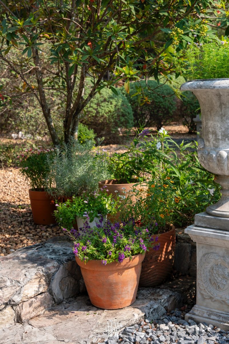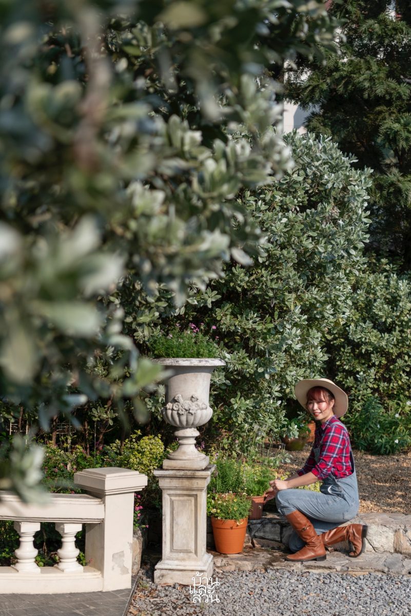 “โซระชอบความคลาสสิกของสวนสไตล์ฝรั่งเศสค่ะ ถ้าเรานึกย้อนไปถึงยุคของกษัตริย์เมื่อหลายร้อยปีก่อน มันมีอะไรที่ยังคงอยู่ในสวนสืบเนื่องมาจนถึงยุคปัจจุบัน เป็น Timeless Garden ที่มีเสน่ห์มีความคลาสสิก แม้จะผ่านเวลามายาวนาน โดยสวนทางฝรั่งเศสตอนเหนือจะใช้ต้นไม้ตัดแต่งแบบสวนฟอร์มัล ส่วนฝรั่งเศสตอนใต้ใช้ต้นมะกอก ต้นไม้สีเทา ๆ ฟ้า ๆ ซึ่งอาจจะดูแห้งไปหน่อย เราเลยใส่ความชอบของเราสองคนผสมลงไปในสวน อย่าง พื้นโรยกรวดแบบสวนเมดิเตอร์เรเนียน และแปลงปลูกดอกไม้แบบสวนคอตเทจค่ะ” คุณโซระ-รัคณาวรรณ วงศ์พิทยาดิศัย เล่าเสริม