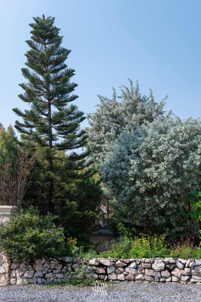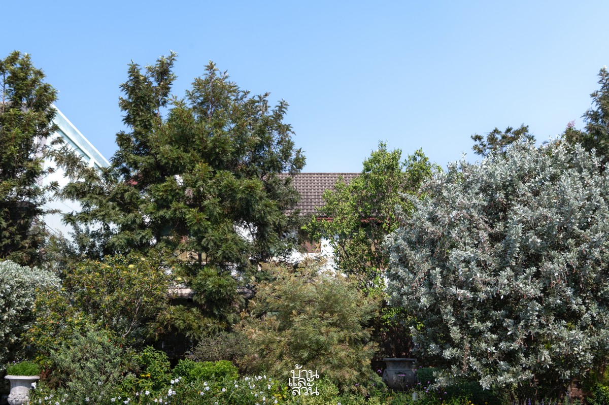 “ถ้าสังเกตุจะเห็นว่าเราปลูกต้นไม้ใหญ่ชิดกับบ้านมาก เพราะตั้งใจจะให้บ้านและสวนดูกลมกลืนกัน จนดูเหมือนต้นไม้จะหุ้มบ้านไว้ทั้งหมดเลยค่ะ นอกจากนี้เรายังตั้งใจให้สวนมีฤดูกสลด้วยค่ะ โดยฤดูฝนสวนเราก็จะดูเขียว ๆ สบายตาหน่อยดอกไม้ในสวนออกดอกสลับหมุนเวียนกันไปในแต่ละช่วงเวลาเหมือนฤดูใบไม้ผลิ ฤดูใบไม้ร่วงเป็นช่วงที่ต้นไม้ออกผล สวนเรามีกิมจ้อ (ส้มจี๊ด) แทนผลมะกอก ทับทิมแคระแทนแอ็ปเปิ้ล ดอกไม้ร่วงโรยใบไม้ผลัดใบก่อนจะเข้าฤดูหนาว แม้จะเป็นสวนเดิมแต่ภาพสวนก็จะเปลี่ยนไปตามช่วงเวลาด้วยพลังของฤดูกาลค่ะ” คุณโซระเสริม
