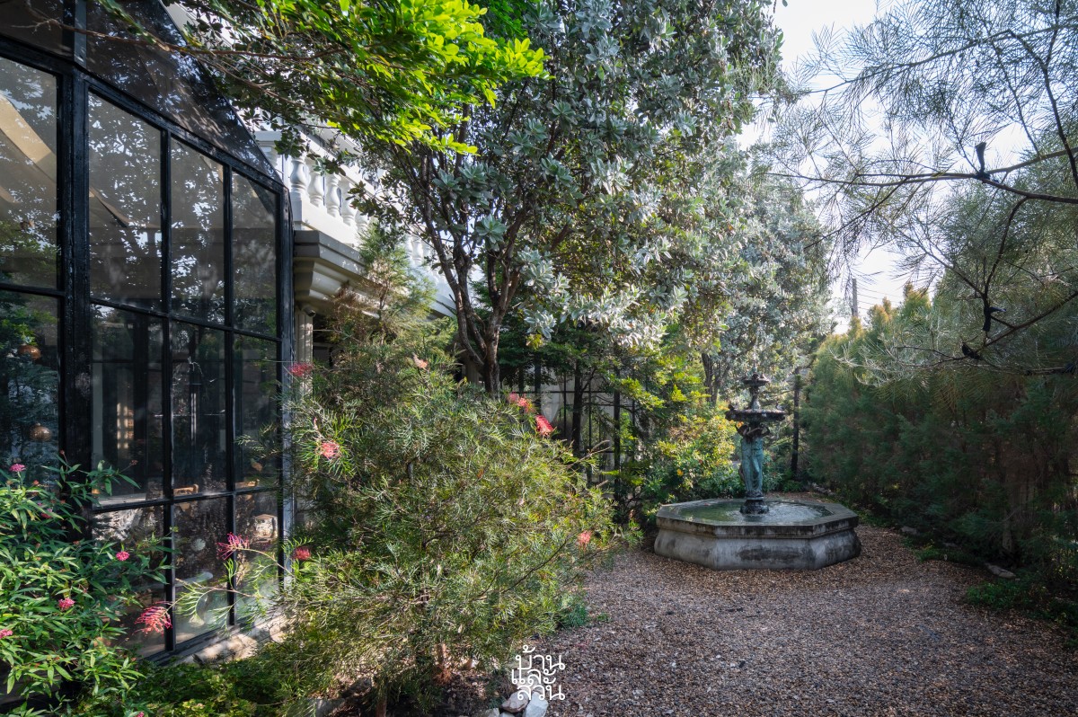 เราเดินมาด้านในบ้านมองออกไปเห็นมุมสวนที่ต่างจากโซนหน้าบ้าน และสะดุดตากับกลาสเฮ้าส์หลังใหญ่ถึง 2 หลังที่เป็นส่วนหนึ่งของบ้าน ไม่แยกไปตั้งอิสระในสวนเหมือนที่เคยเห็นทั่วไป คุณบอมบ์อธิบายให้ฟังว่า “สวนข้างบ้านจะมีความเป็นสวนทางฝรั่งเศสตอนเหนือ มีกลาสเฮ้าส์ 2 หลัง โดยมีน้ำพุคั่นอยู่ตรงกลาง ดูสมมาตรตามแบบสวนฟอร์มัล พื้นโรยกรวดให้อารมณ์แบบสวนเมดิเตอร์เรเนียน ปลูกต้นไม้ใบละเอียดสีออกเทาขาวแซมด้วยไม้ดอกแบบสวนคอตเทจ ให้ภาพรวมคล้ายสวนโมเนต์ครับ“