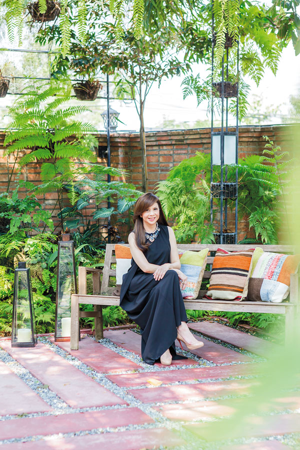 “อีกหนึ่งมุมโปรดที่ชอบไม่แพ้กันคือสวนในห้องน้ำกึ่งเอ๊าต์ดอร์ของบ้านหลังเล็ก ซึ่งแบ่งการใช้งานเป็นสัดส่วน โดยแยกห้องอาบน้ำให้อยู่ด้านนอก เพื่อให้ได้ใกล้ชิดกับธรรมชาติ ส่วนที่เป็นพื้นที่แห้งจะอยู่ด้านในติดกับตัวบ้าน เมื่อก่อนด้านนอกเป็นพื้นหินแกรนิตเรียบๆโล่งๆ เพื่อนเสนอไอเดียให้ทำเป็นสวนทรอปิคัล จำลองบรรยากาศของธรรมชาติที่ขึ้นตามซอกหิน ซึ่งมีทั้งมอสส์ กลุ่มเฟิน และกล้วยไม้ จัดวางเป็นกลุ่มผสมกัน จนตอนนี้เจริญเติบโตกันแน่นเต็มผนัง เวลาใช้ห้องน้ำมองออกไปแล้วรู้สึกสดชื่นสบายตา พอได้อยู่กับต้นไม้ก็ทำให้เรามีความสุขมากขึ้น”
