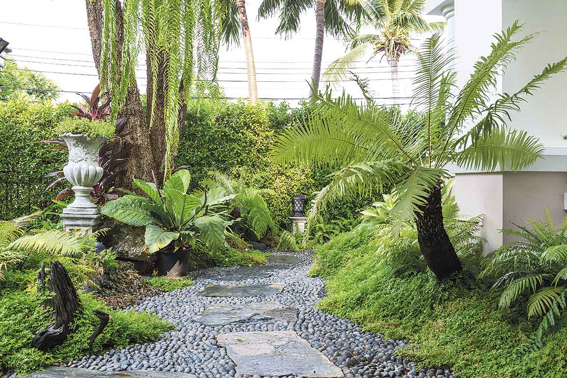 สวนนี้มีการวางผังบริเวณแบบง่าย ๆ หน้าบ้านทำเป็นมุมนั่งเล่นพักผ่อน โอบล้อมด้วยกำแพงต้นไทรเกาหลีตัดแต่งจนเป็นพุ่มแน่นสวยงาม มีทางเดินหินกาบผสมกับกรวดแสตมป์เรียงตัวกันทั้งผืนทอดยาวอ้อมไปยังระเบียงนั่งเล่นอีกฝั่งของตัวบ้าน และมีกลุ่มไม้พุ่มขนาบข้างซ้าย – ขวาตลอดทั้งเส้นทางเดิน กรวดแต่ละก้อนบนพื้นที่วางเรียงต่อกันไปเรื่อย ๆ อย่างตั้งใจ กลุ่มพรรณไม้ผิวสัมผัสใบละเอียด รวมไปถึงหินคอบเบิลก้อนเล็ก ๆ ที่วางรวมกันจนกลายเป็นลานขนาดใหญ่รายละเอียดเล็ก ๆ น้อย ๆ เหล่านี้เองที่มีส่วนทำให้สวนสวยแห่งนี้เต็มไปด้วยความละมุนละไมและรื่นรมย์อย่างที่เจ้าของบ้านปรารถนา