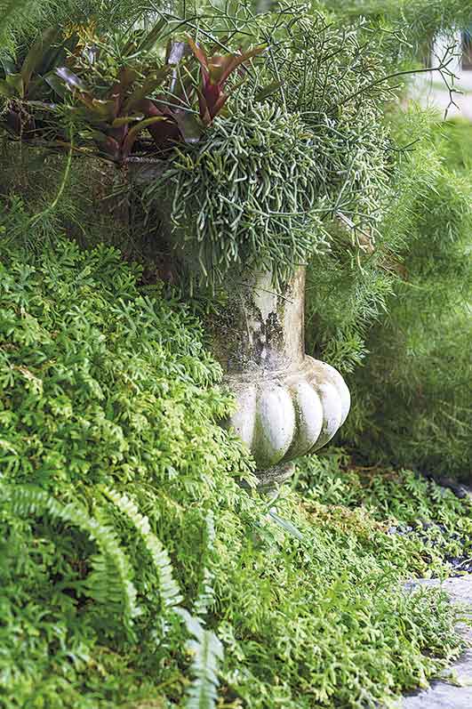 ผู้ออกแบบใช้วิธีผสมผสานพรรณไม้หลายชนิดที่มีฟอร์มใกล้เคียงกันมาจัดวางให้ดูเป็นธรรมชาติและเป็นตัวเชื่อมระหว่างสวนสองสไตล์ได้อย่างกลมกลืน เป็นไอเดียที่ใช้ได้ทั้งกับสวนที่มีพื้นที่กว้างและแคบ