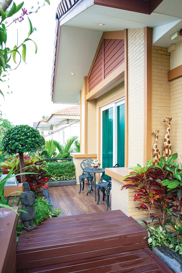 “พอมีสวนบนระเบียงชั้นสอง ลูกสาวก็จัดปาร์ตี้กับเพื่อน ๆบ่อย ทานบุฟเฟ่ต์เล็ก ๆ บาร์บีคิวกันง่าย ๆบนนั้น อากาศช่วงกลางคืนเย็นสบาย เห็นแสงไฟในสวน เขาจะมานั่งกันคุยกัน 4-5 คน บางครั้งก็ 8 คน หรือถ้าเป็นช่วงเช้าพี่เปิดจากห้องนอนออกมาก็มานั่งดื่มกาแฟบนนี้บ้าง ลงไปในสวนด้านล่างบ้าง แต่ถึงแม้ว่าเราจะอยู่ในบ้านก็สามารถเห็นสวนได้ทั้งหมดค่ะ เพราะผนังด้านนี้จะมีกระจกโปร่งให้มองออกไป ถ้าเปรียบเทียบกับบ้านหลังเก่า ที่นั่นเราใช้น้อยมากไม่ค่อยได้เห็นอะไร เพราะอยู่ในห้องปิดไปหมด ช่วงเช้าในสวนนี้สดชื่นมาก จะมีนกต่าง ๆบินมา มีเสียงเล่นน้ำ อาบน้ำตรงบ่อปลา กลับจากทำงานเครียดๆมา พอเห็นบรรยากาศอย่างนี้ความเครียดหายไปเลยค่ะ”