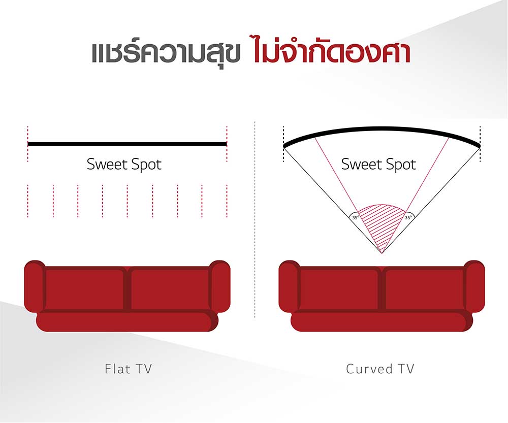 สำหรับทีวีหน้าจอโค้ง ผู้รับชมจะสามารถเพลิดเพลินกับคุณภาพภาพที่ดีที่สุด ได้จากตำแหน่งที่อยู่ตรงกึ่งกลางหน้าจอพอดิบพอดีเท่านั้น ซึ่งจะว่าไปแล้วก็ฟังก์ชั่นนี้คงไม่ตอบโจทย์สำหรับบ้านที่มีสมาชิกหลายคนต้องแย่งชิงตำแหน่ง Sweet Spot หรือตำแหน่งการรับชมที่ดีที่สุดนั่นคือตรงกลางหน้าจอกัน ในทางตรงกันข้ามทีวีจอตรงสามารถขจัดปัญหาข้อนี้ได้อย่างง่ายดาย ด้วยดีไซน์หน้าจอที่ตรงระนาบไปกับแนวผนัง ทุกคนในห้องจะสามารถดื่มด่ำกับภาพบนหน้าจอได้ในทุกมุมมองไม่ว่าจะรับชมจากองศาใดก็ตามก็ยังเห็นภาพคมชัด สีสันไม่ผิดเพี้ยน